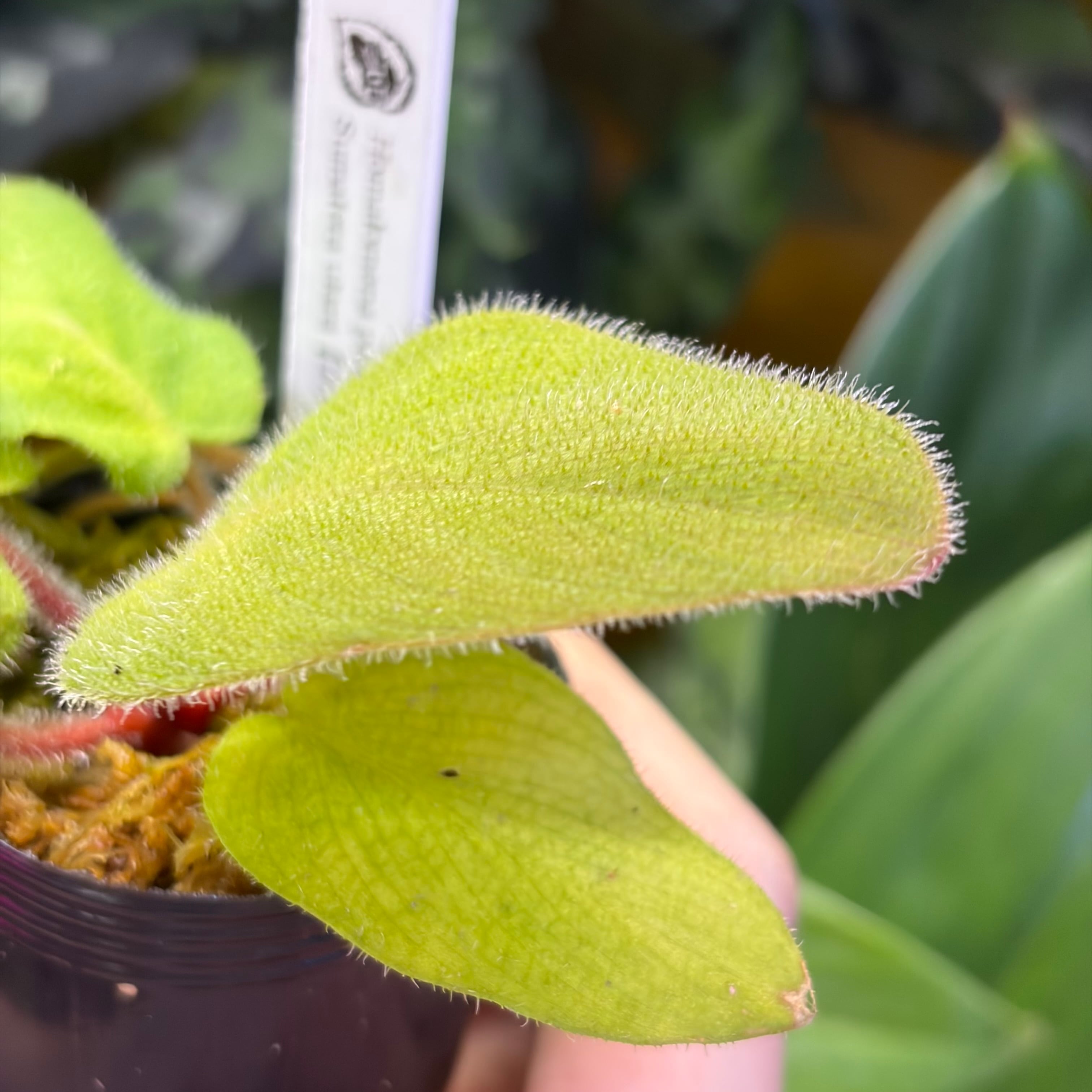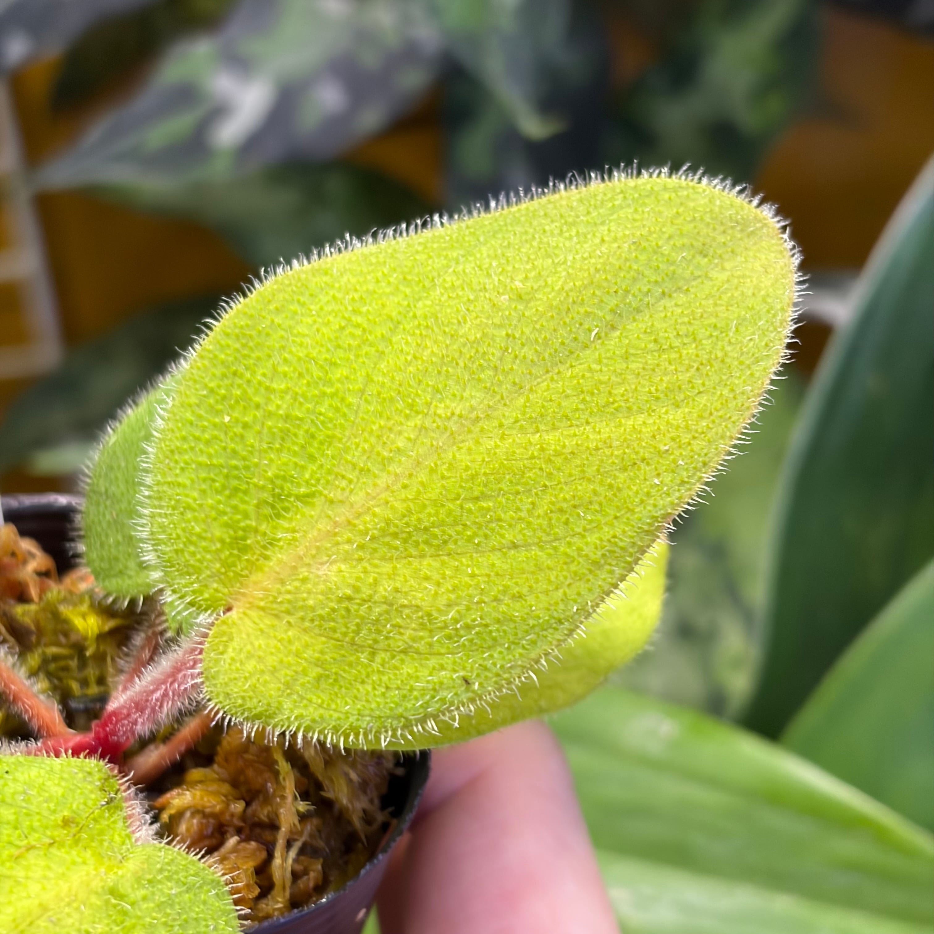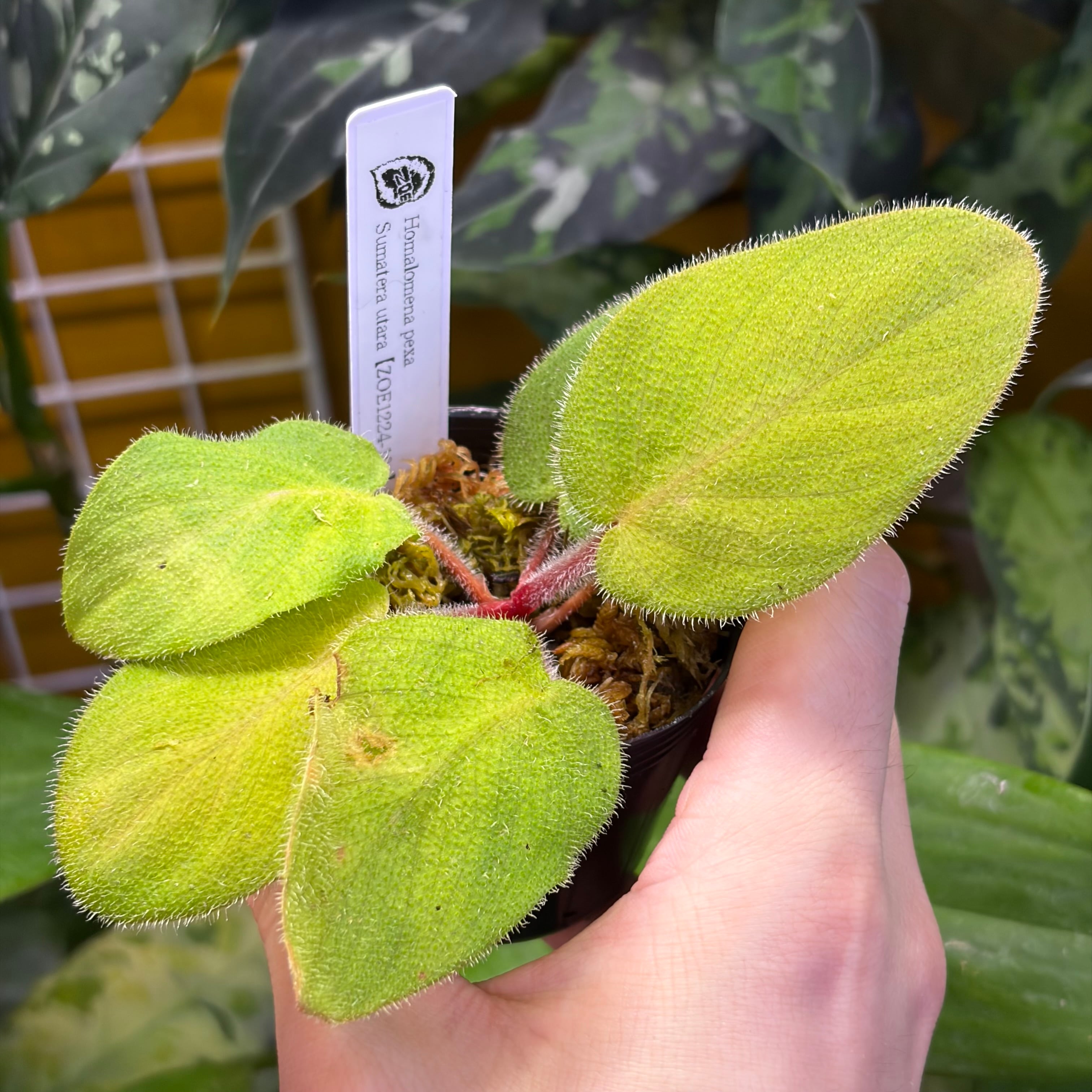 葉の裏表、葉柄、花など根を除くすべてにフサフサの産毛が生えている珍妙なホマロメナです。