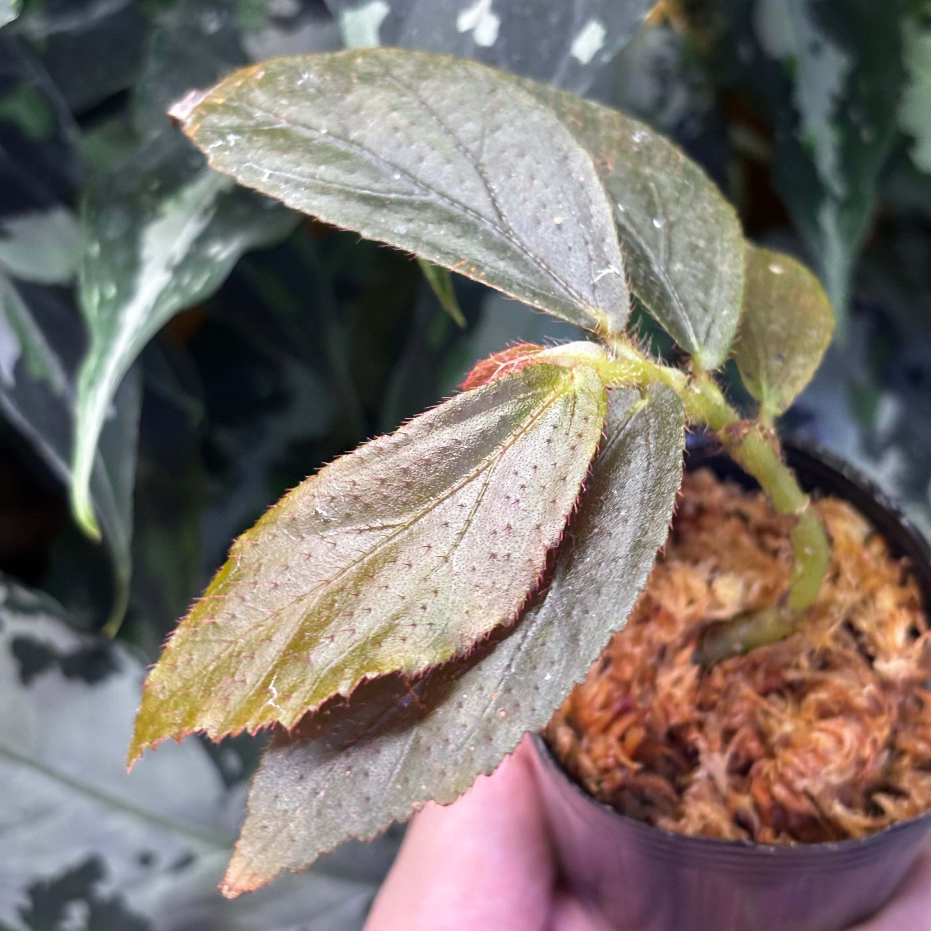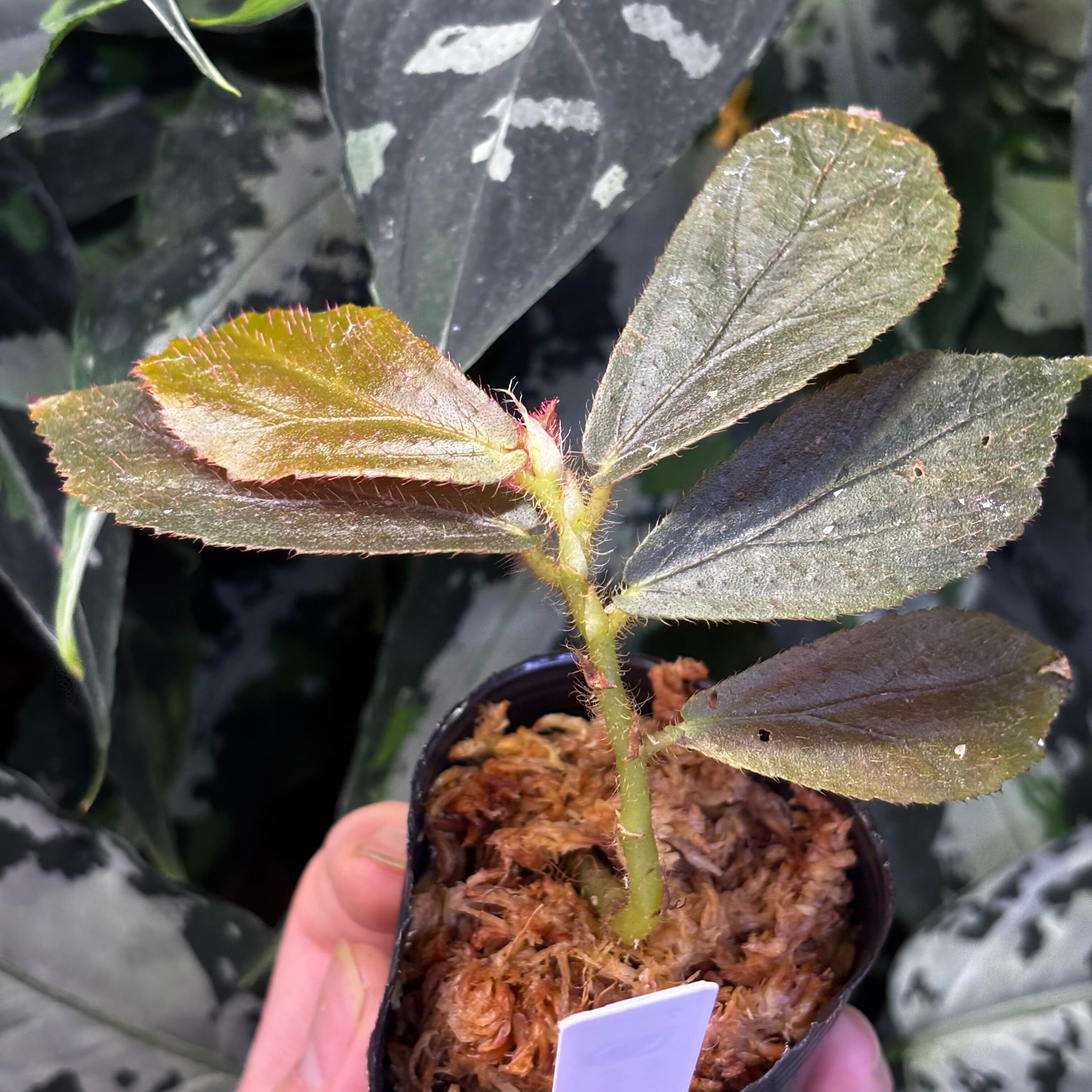 エラトステマそっくりの姿が特徴的で、黒い葉に棘がうっすらと生えているカッコいいベゴニアです。