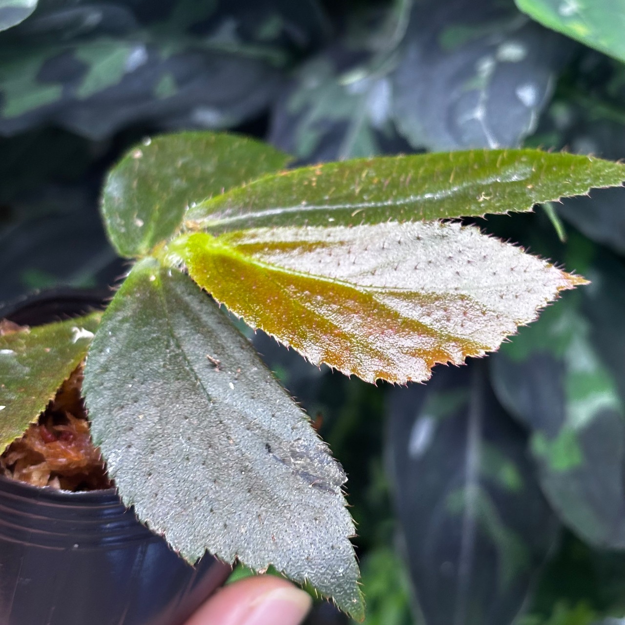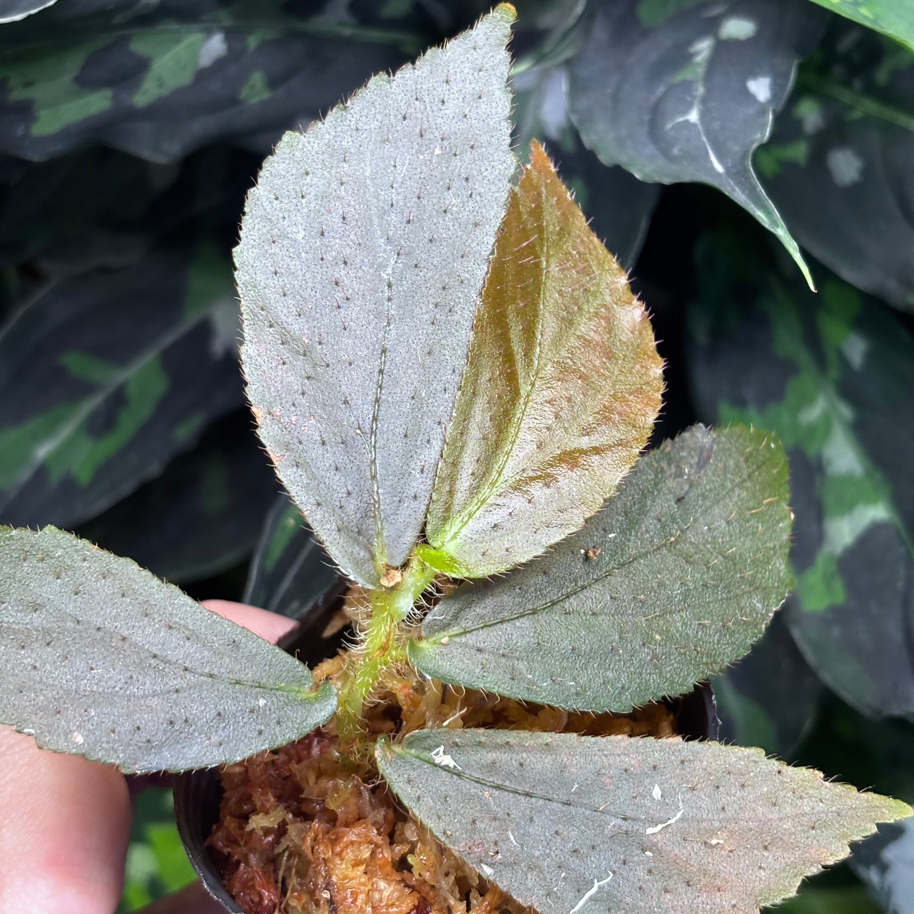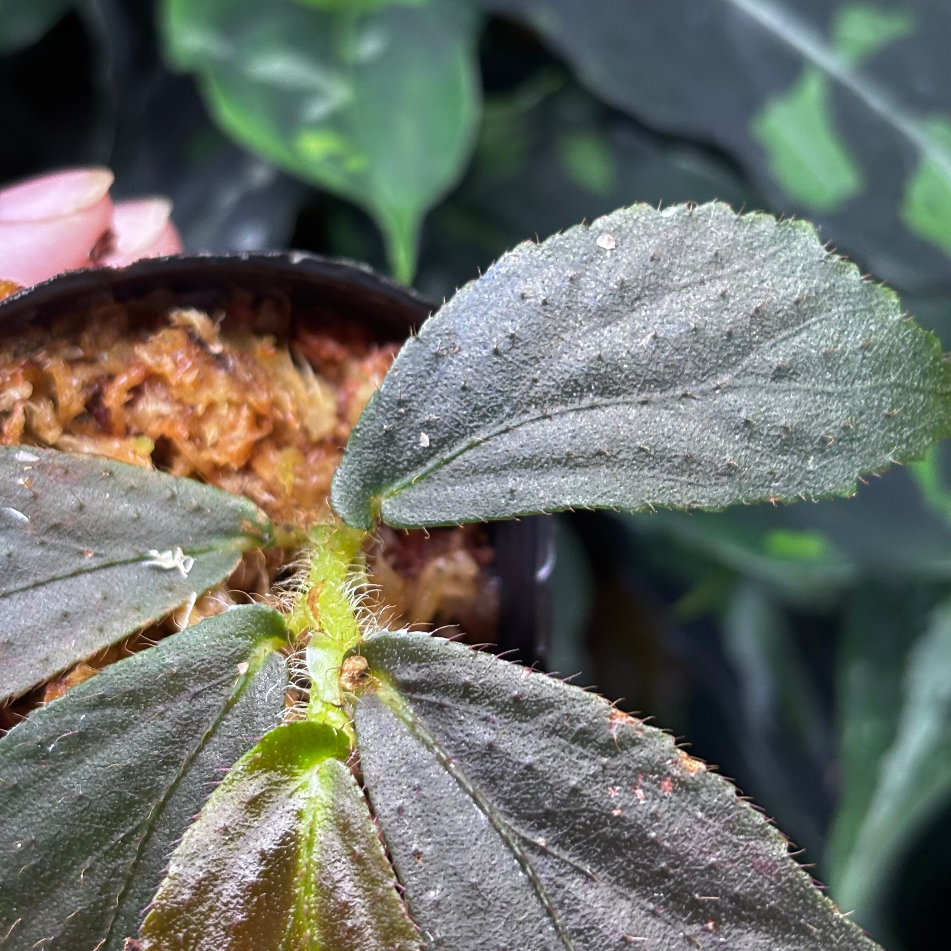 エラトステマそっくりの姿が特徴的で、黒い葉に棘がうっすらと生えているカッコいいベゴニアです。