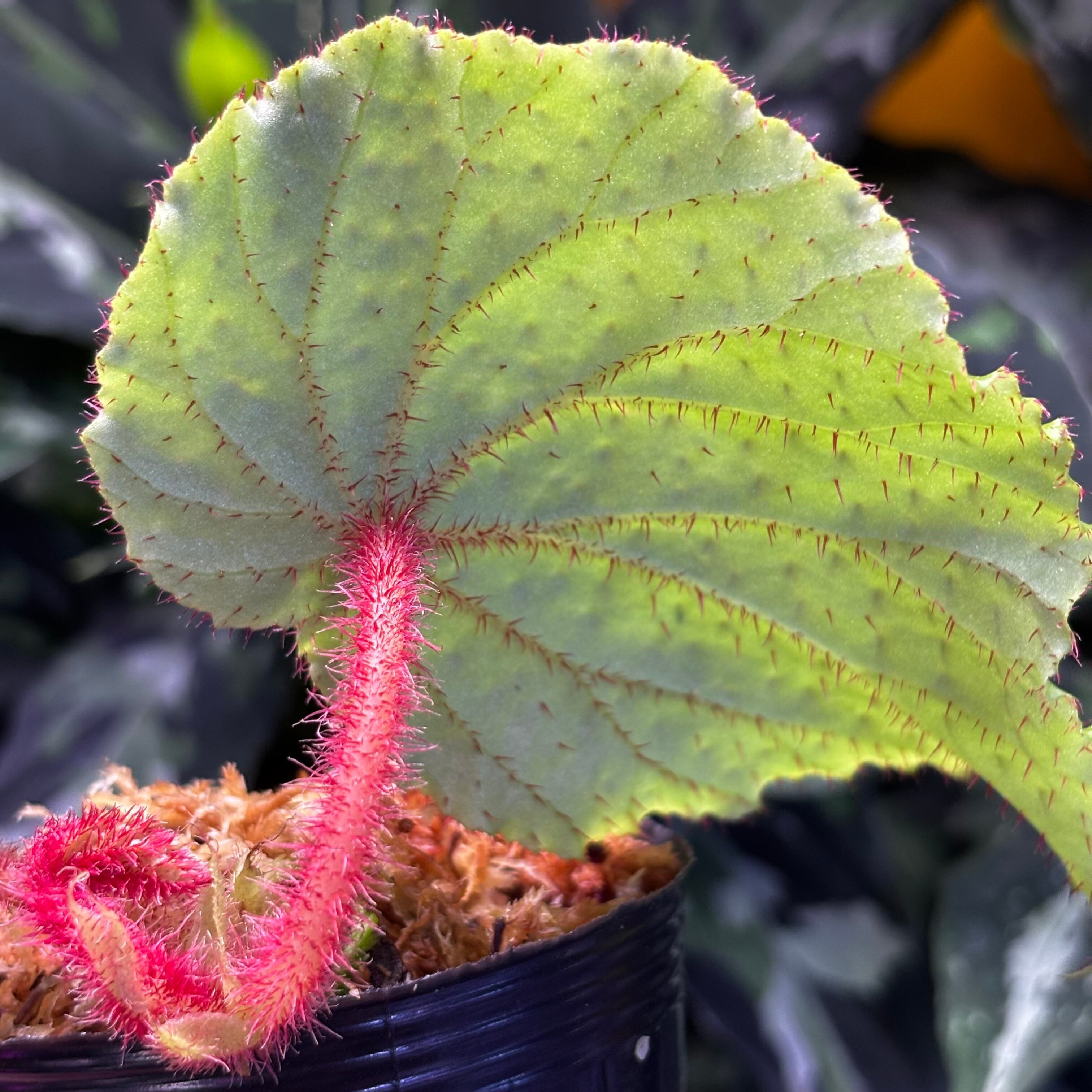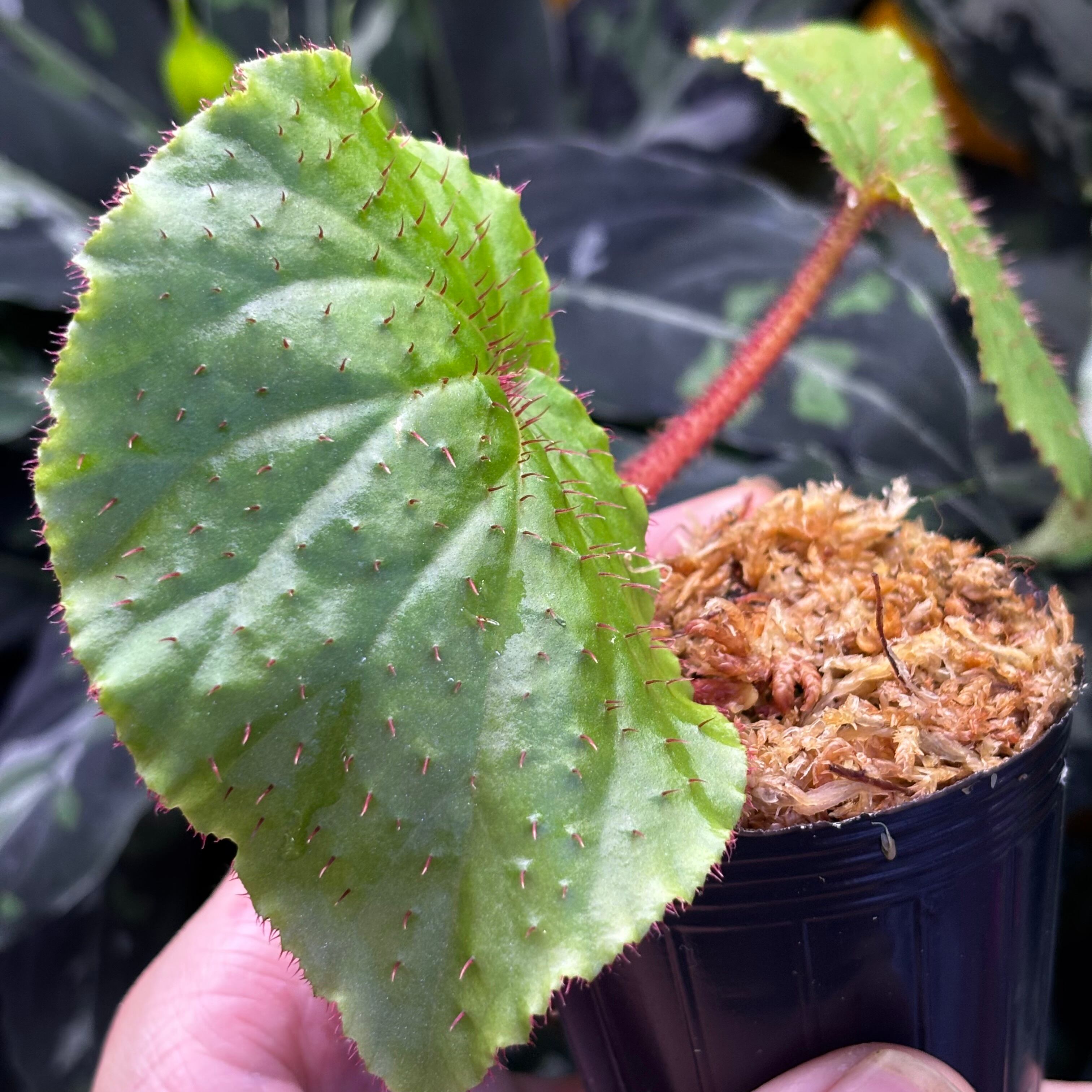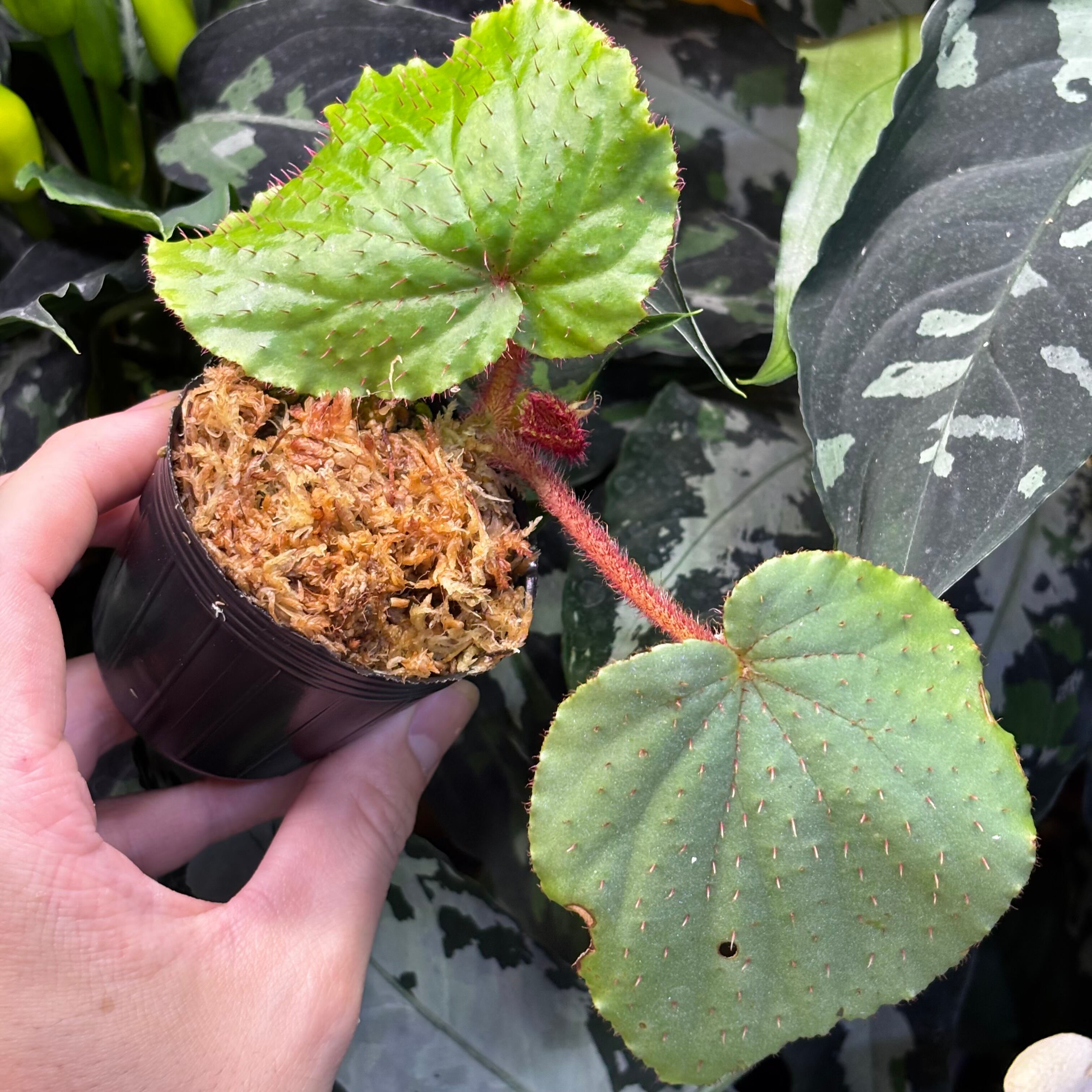 葉の表面、裏、葉柄や茎にまでびっしりと赤いトゲが生えているのが特徴です。limprichtiiと特徴が似ていますが、こちらの方が大型で、limprichtiiは雲南省原産と産地も全く異なるため別種と思われます。
