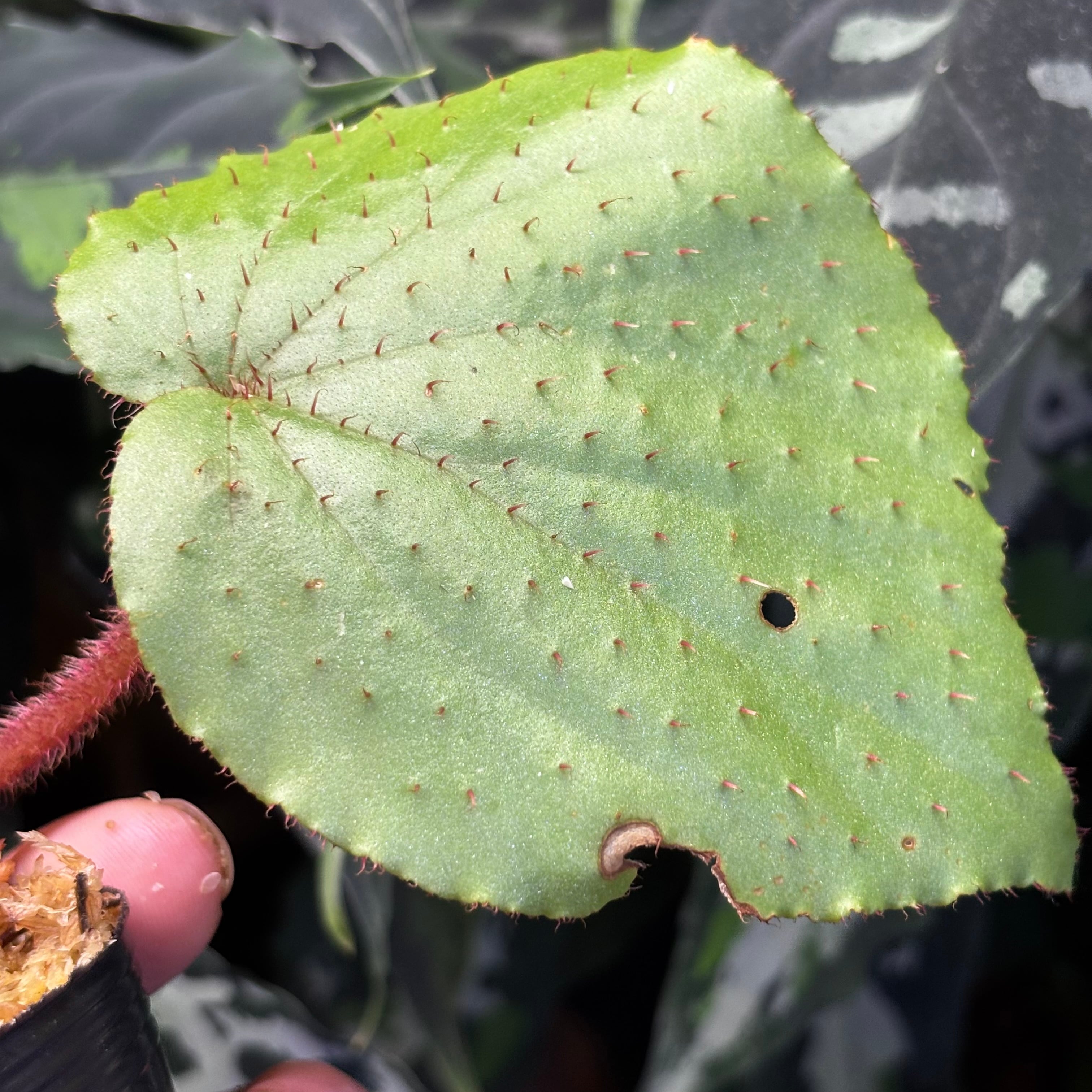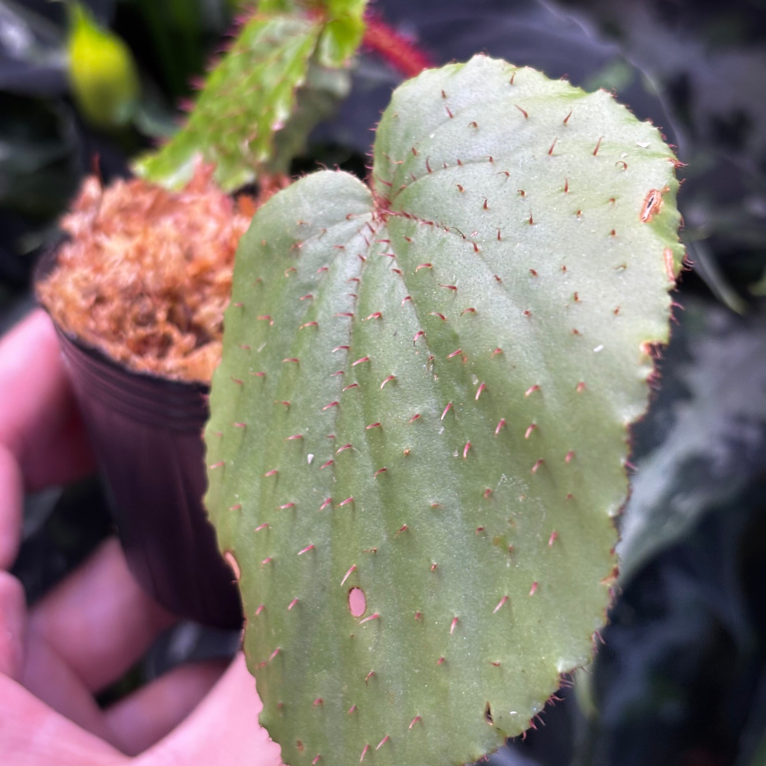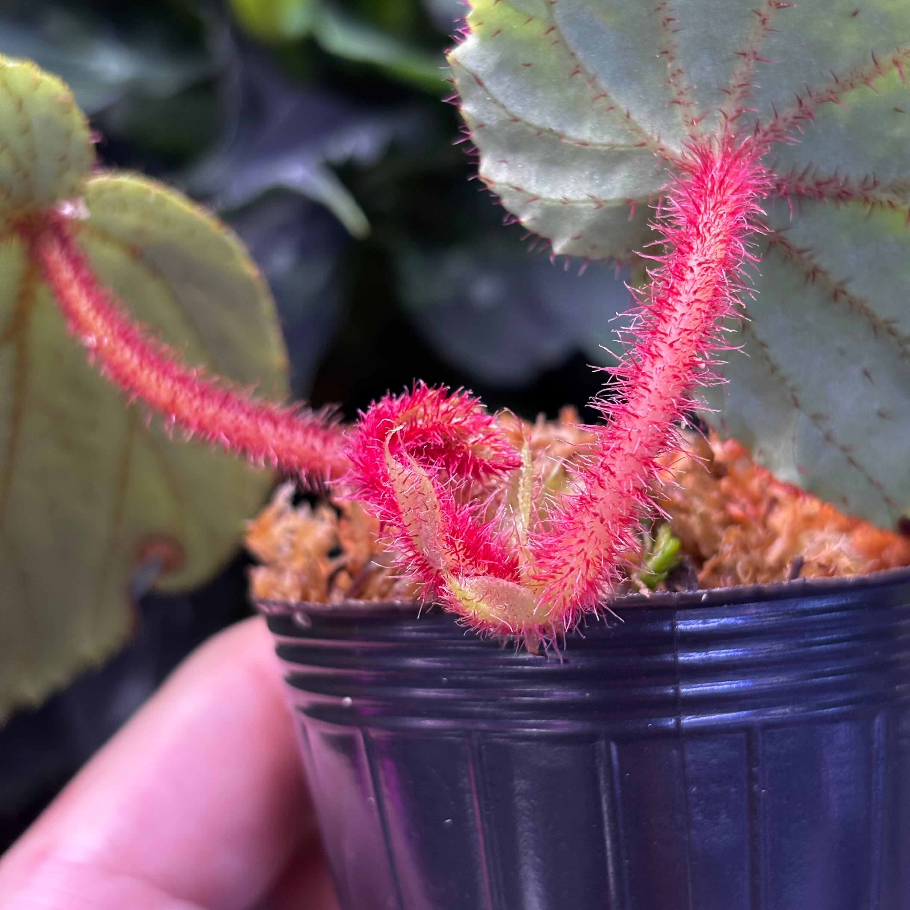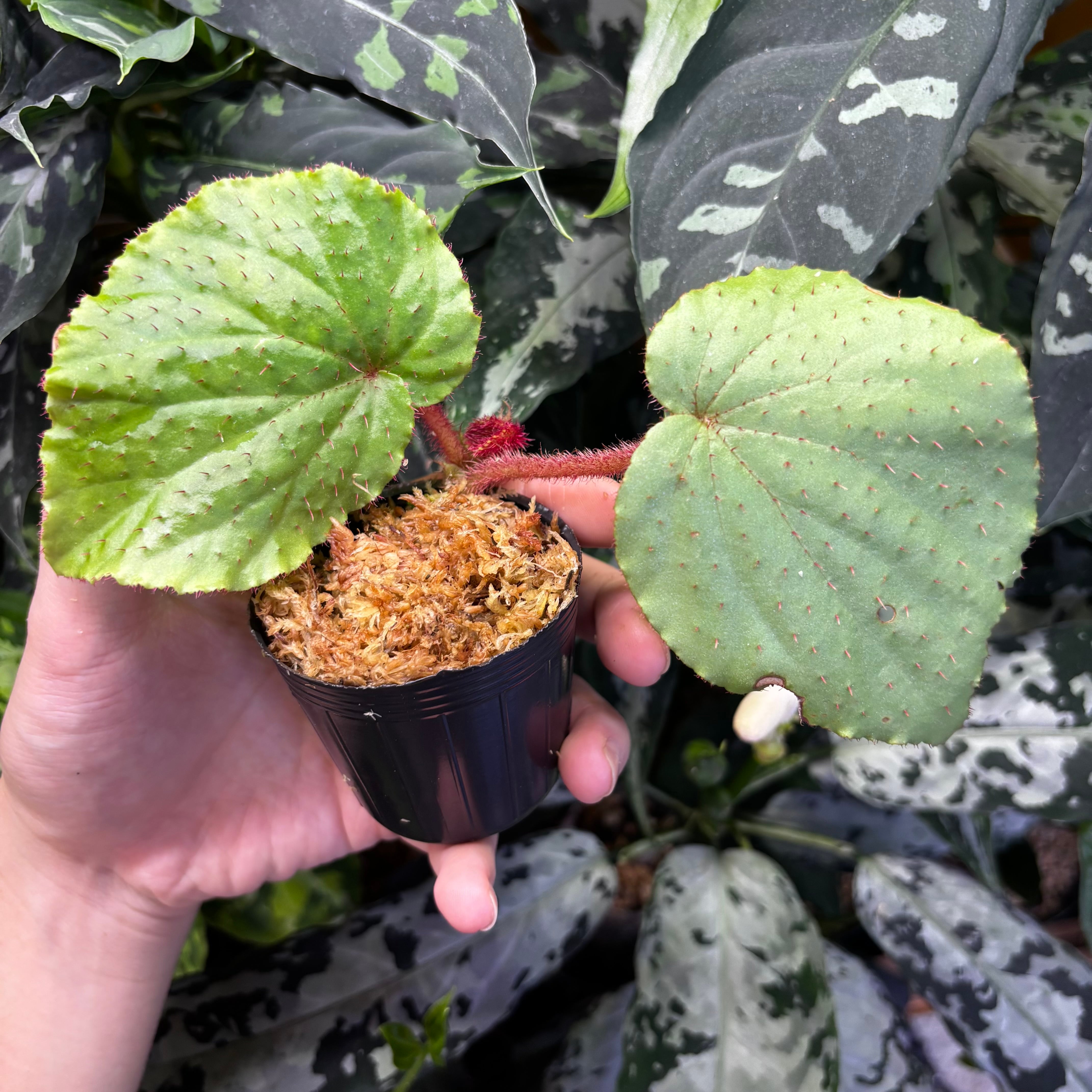 葉の表面、裏、葉柄や茎にまでびっしりと赤いトゲが生えているのが特徴です。limprichtiiと特徴が似ていますが、こちらの方が大型で、limprichtiiは雲南省原産と産地も全く異なるため別種と思われます。