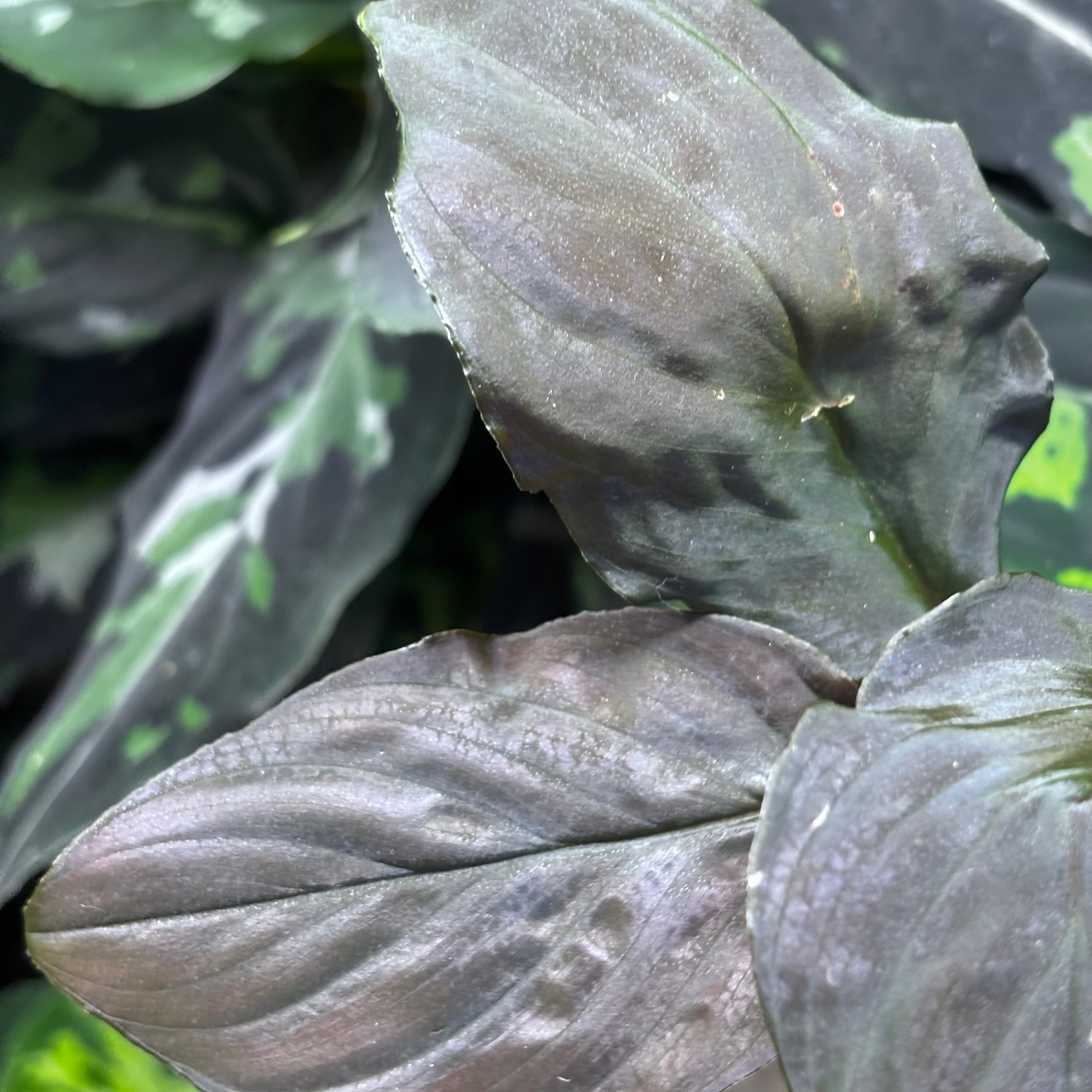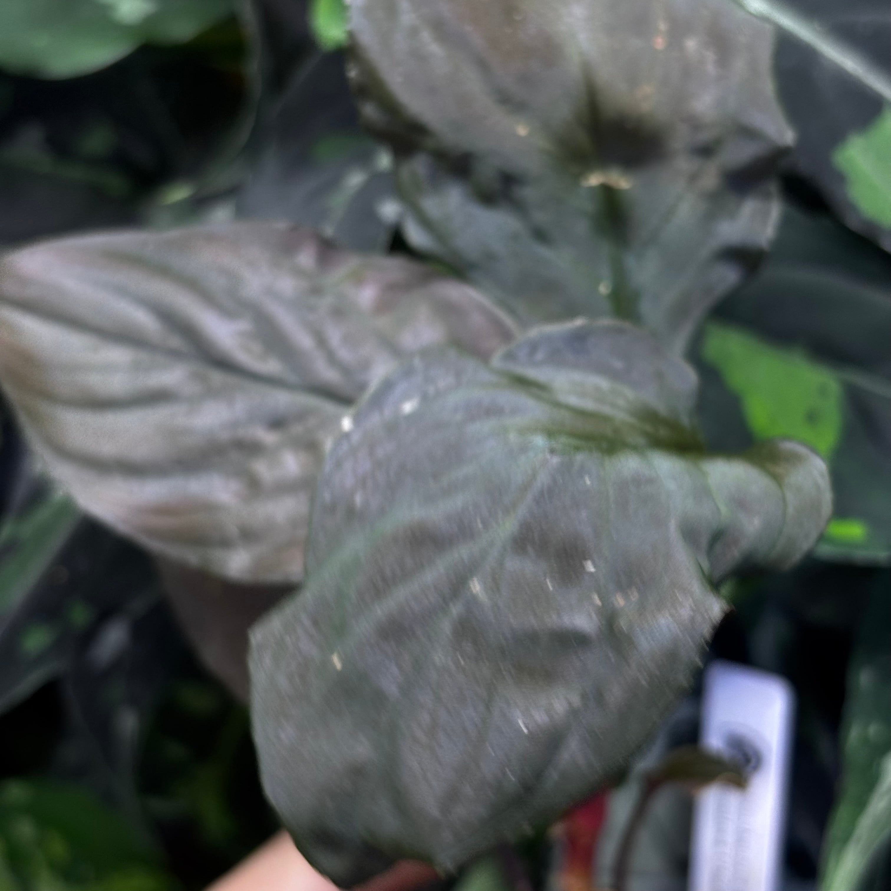 葉の表面の天鵞絨が強く、やや細葉の黒葉が特徴です。全体的に黒〜紫の色味が美しい株です。特に新芽が固まってくるに連れての色の変化が豊富で綺麗ですよ。
