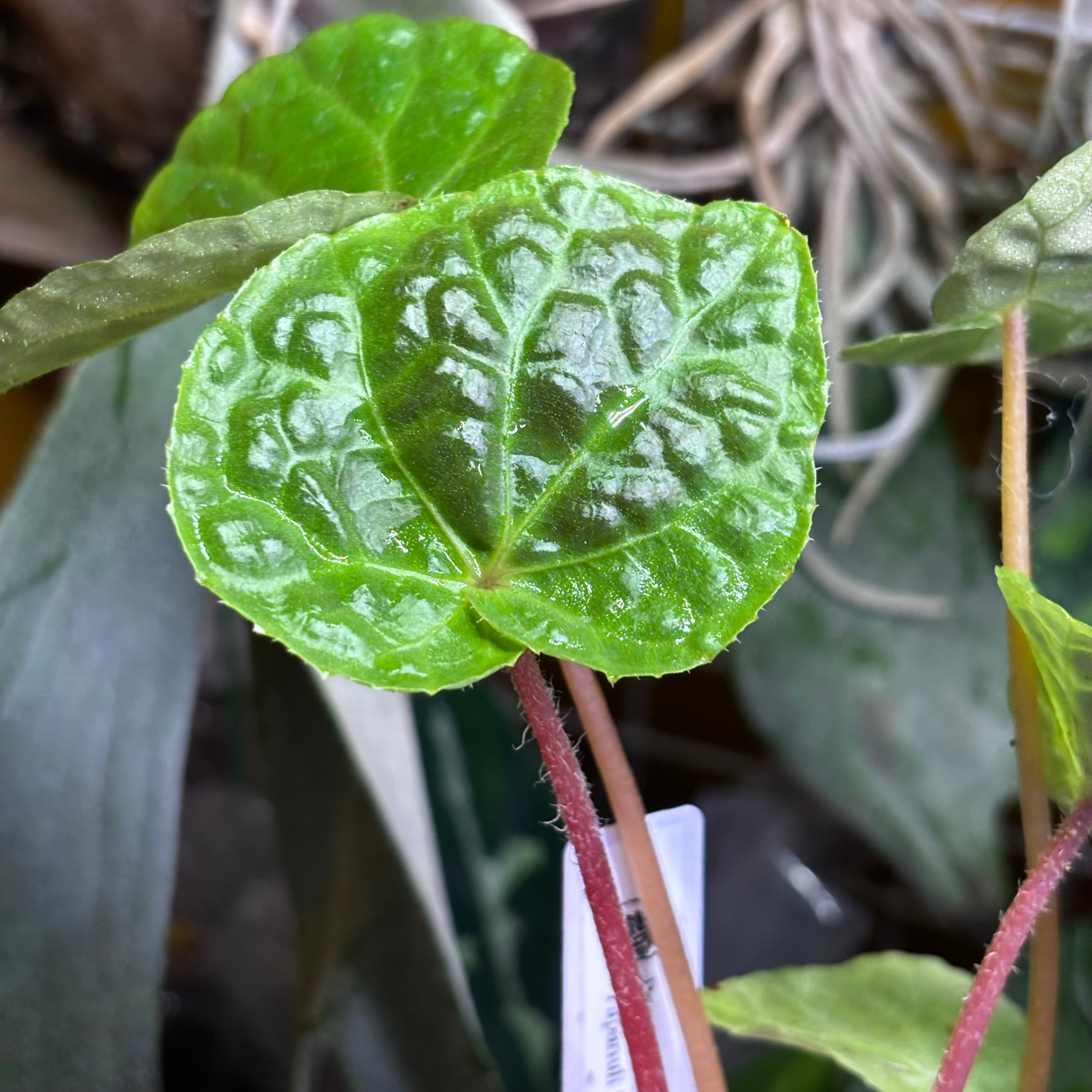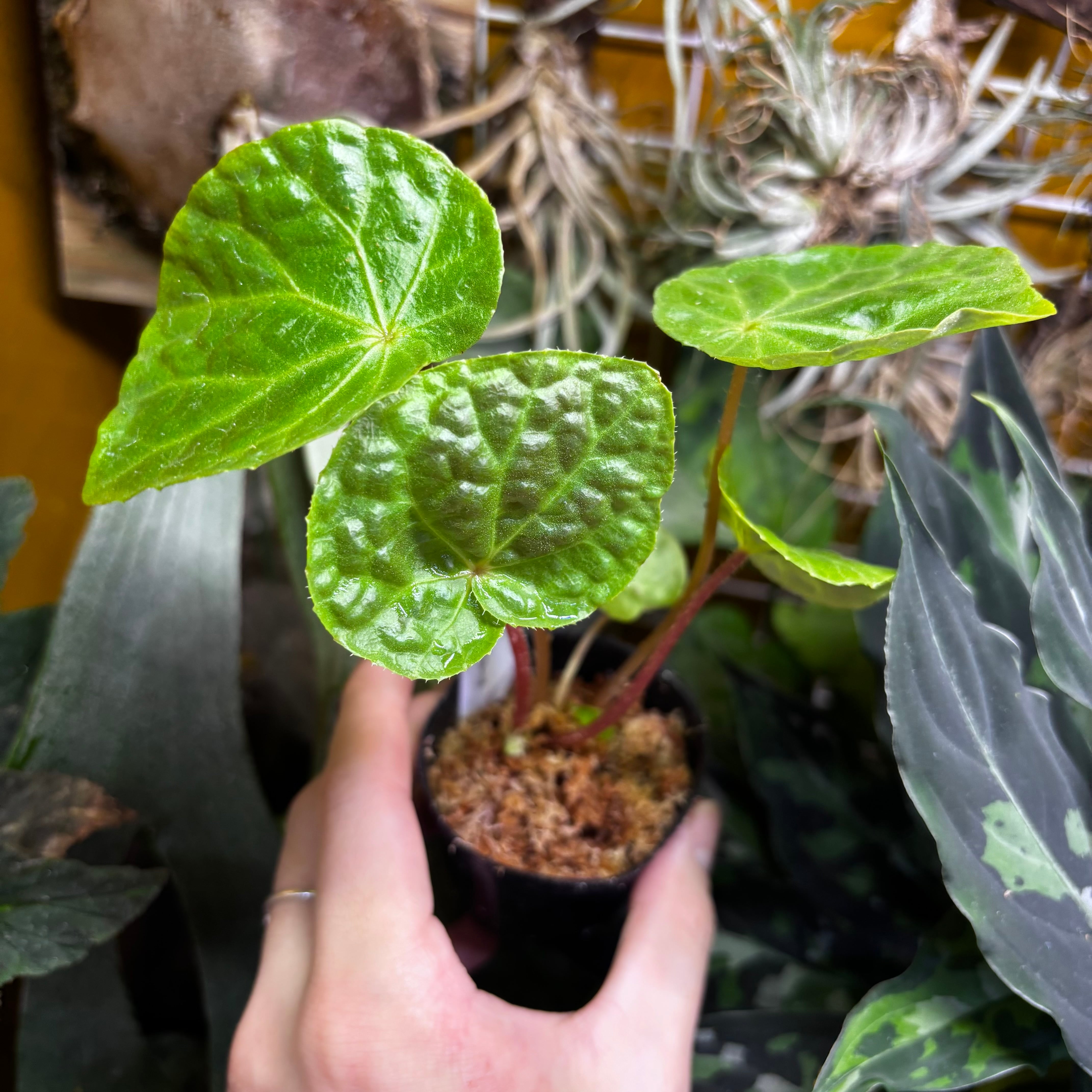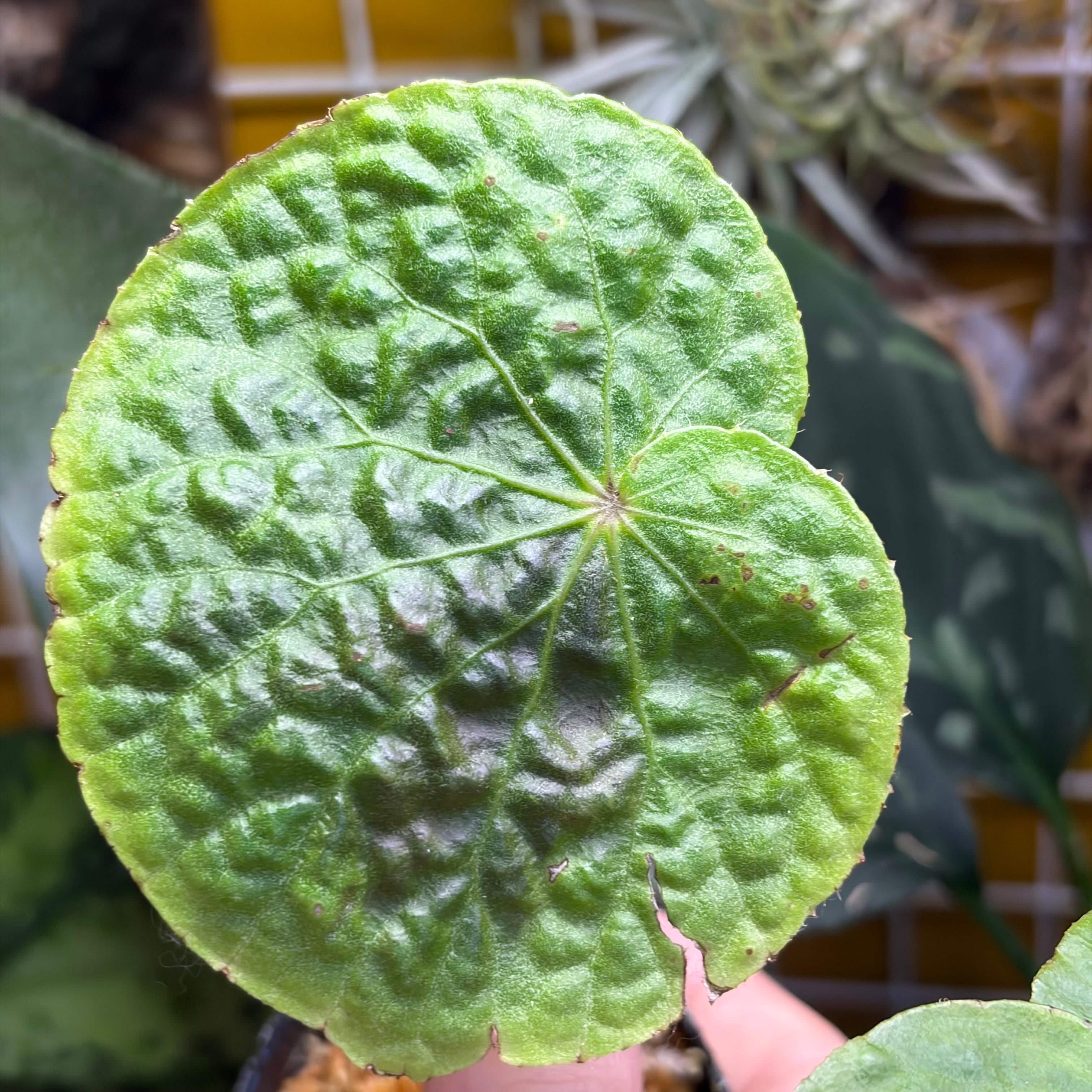 凹凸のある丸葉で、中央の一区画だけ塗られたような他には無い面白い葉模様を持つ根茎性のベゴニアです。種からの実生のため個体差がございます。