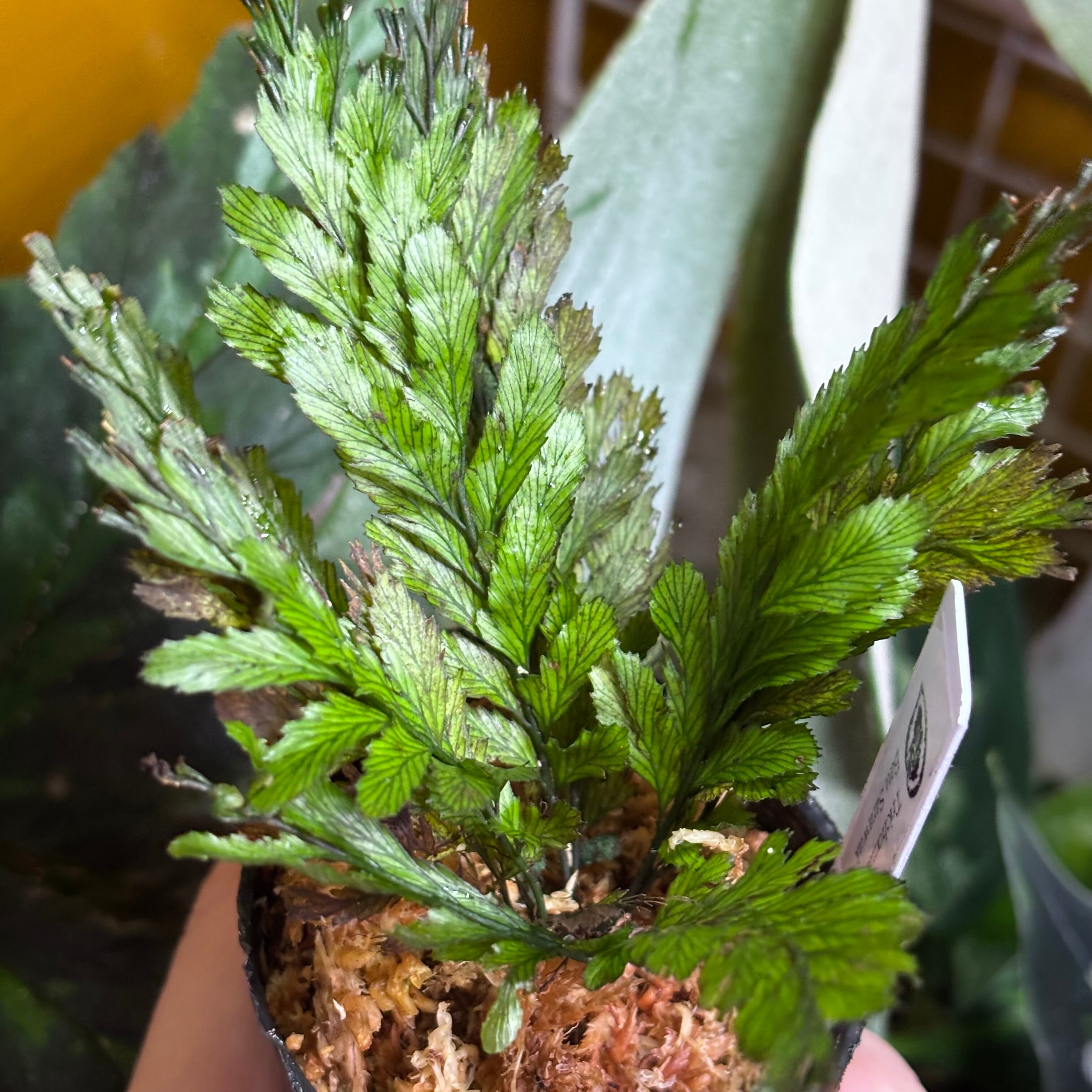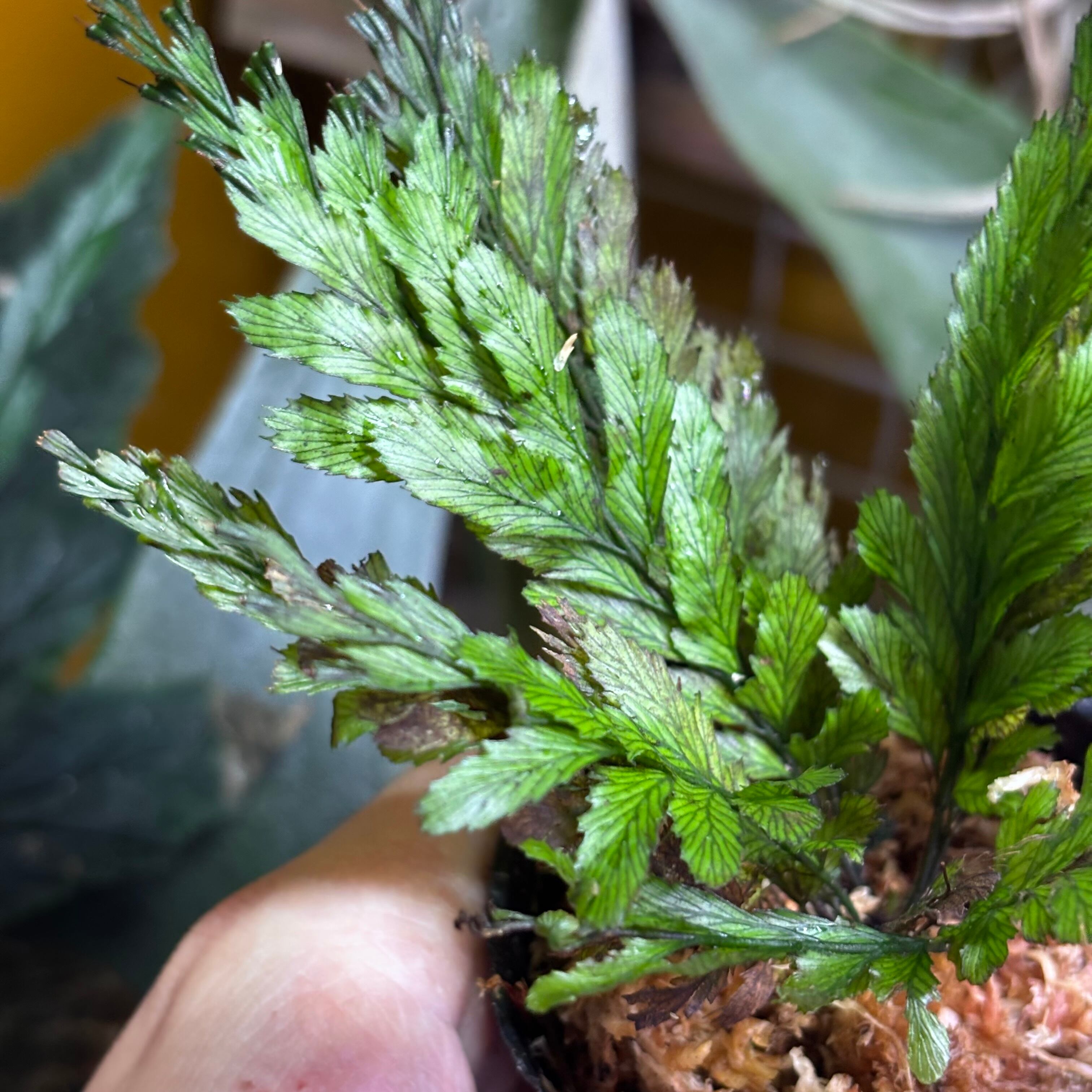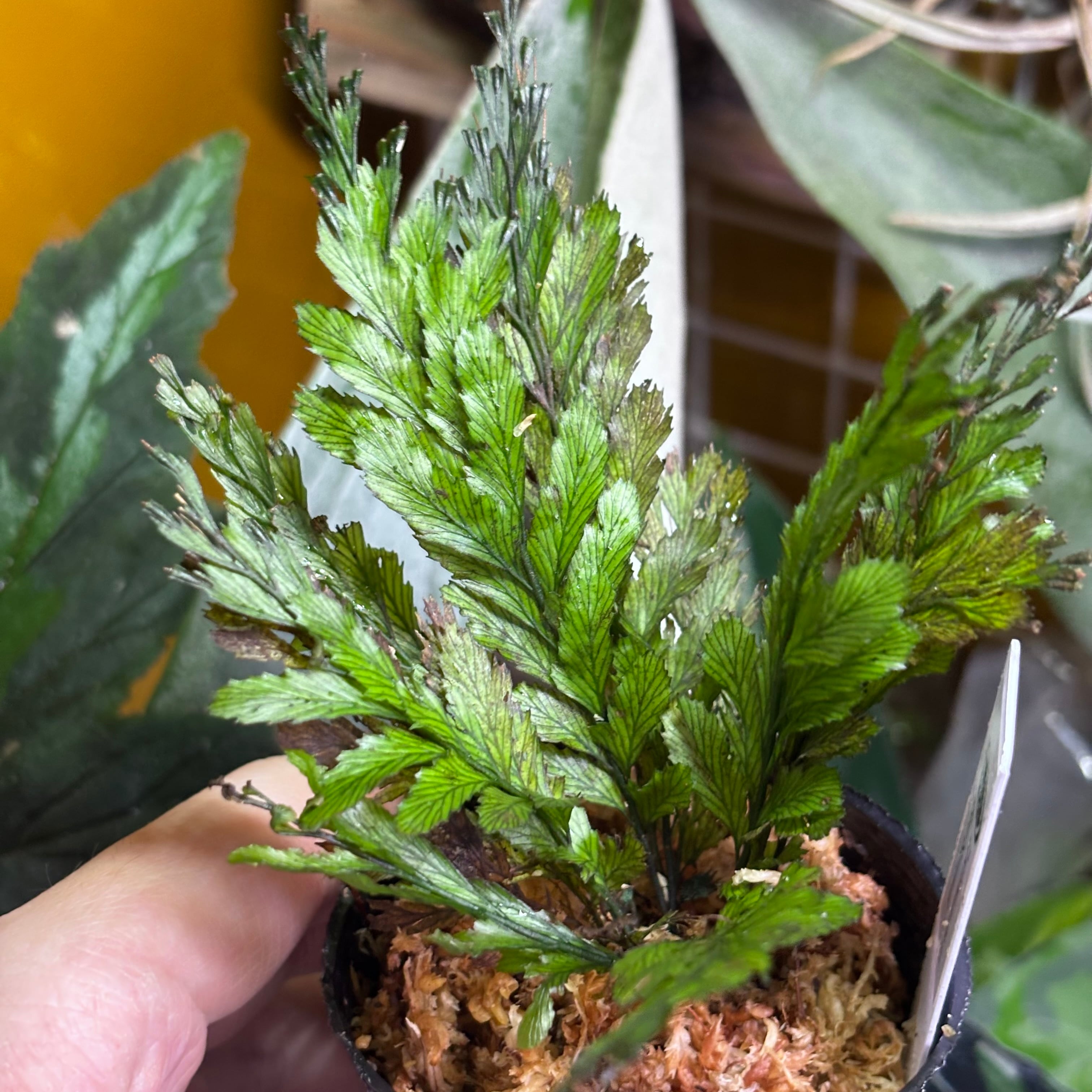 半透明で繊細な葉を持つ美しいシダ植物です。その見た目とは裏腹に葉は硬く力強い株です。