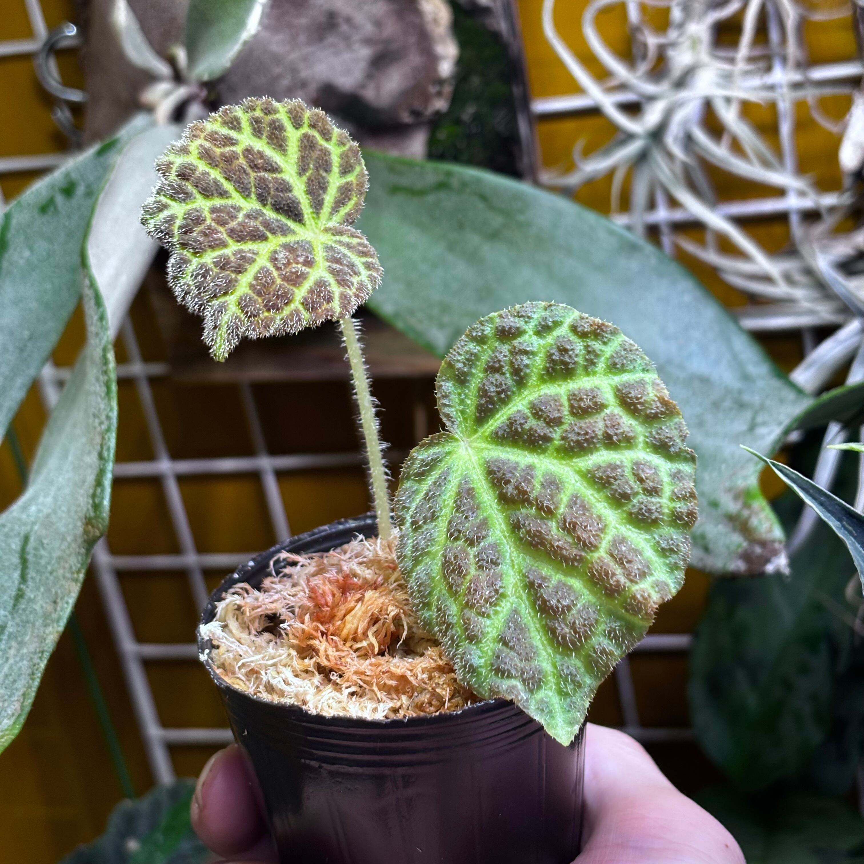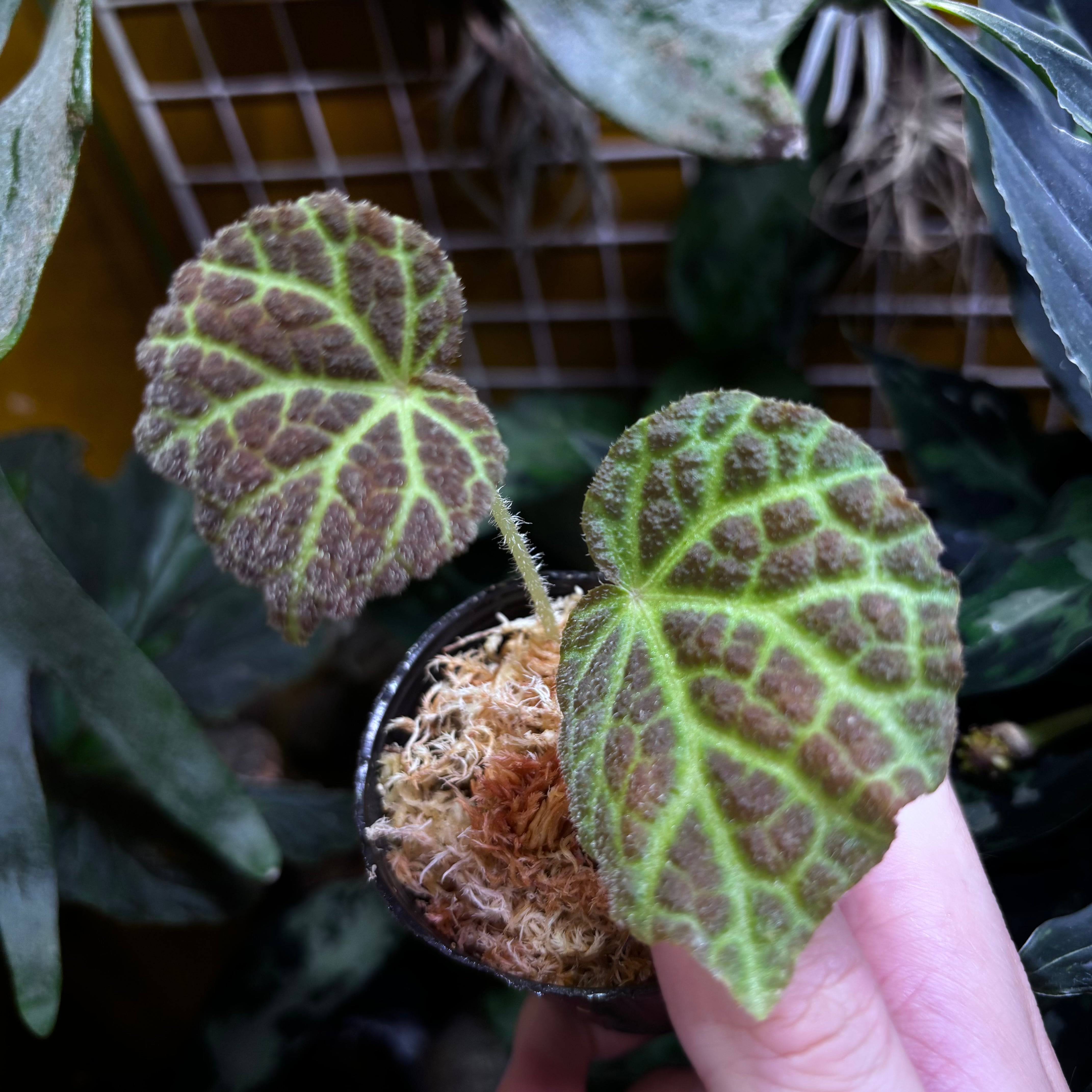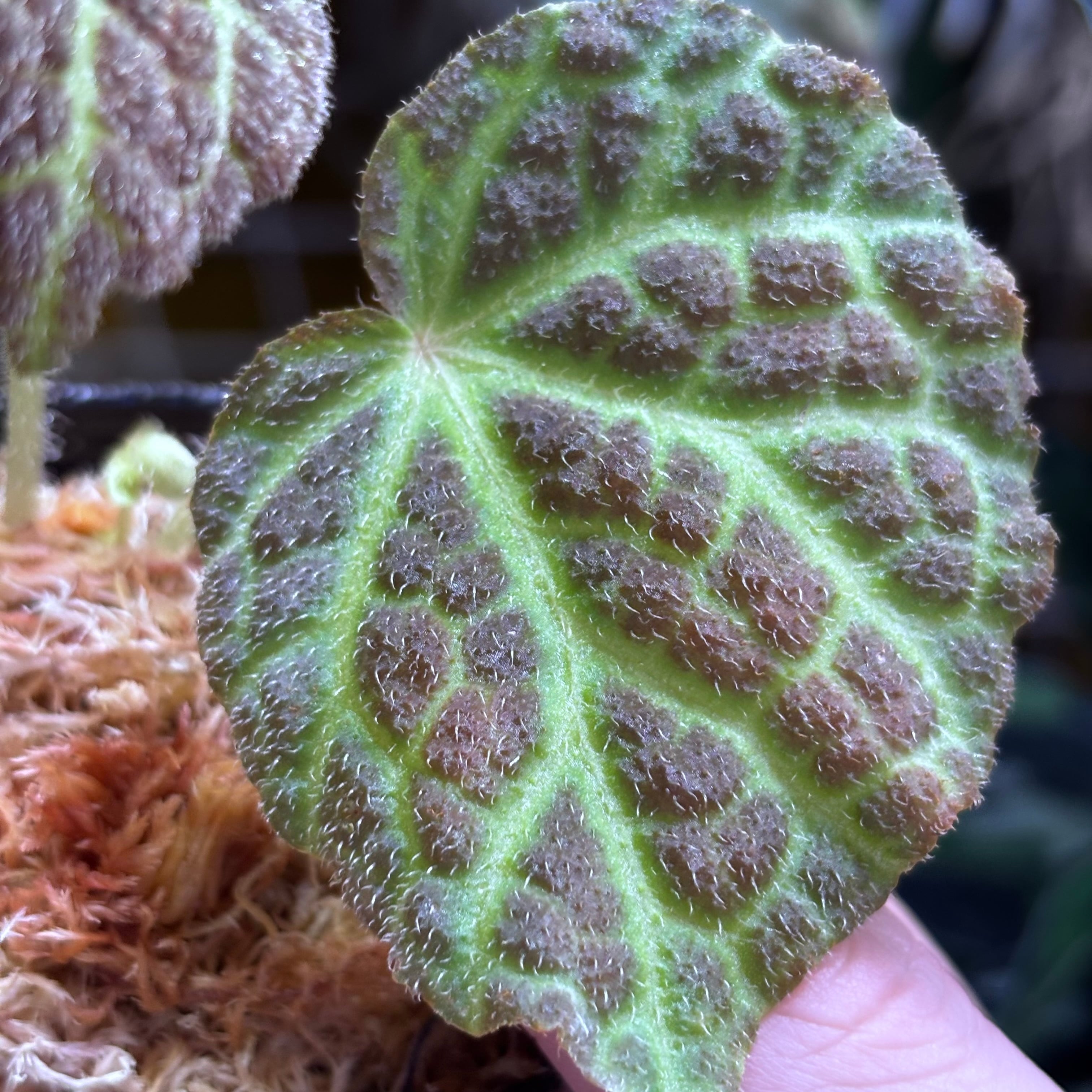 表面にザラザラとした産毛が生え、葉脈が光るように見える天鵞絨のベゴニアです。一見クロロネウラやデコラにも似ていますが、全くの別種です。