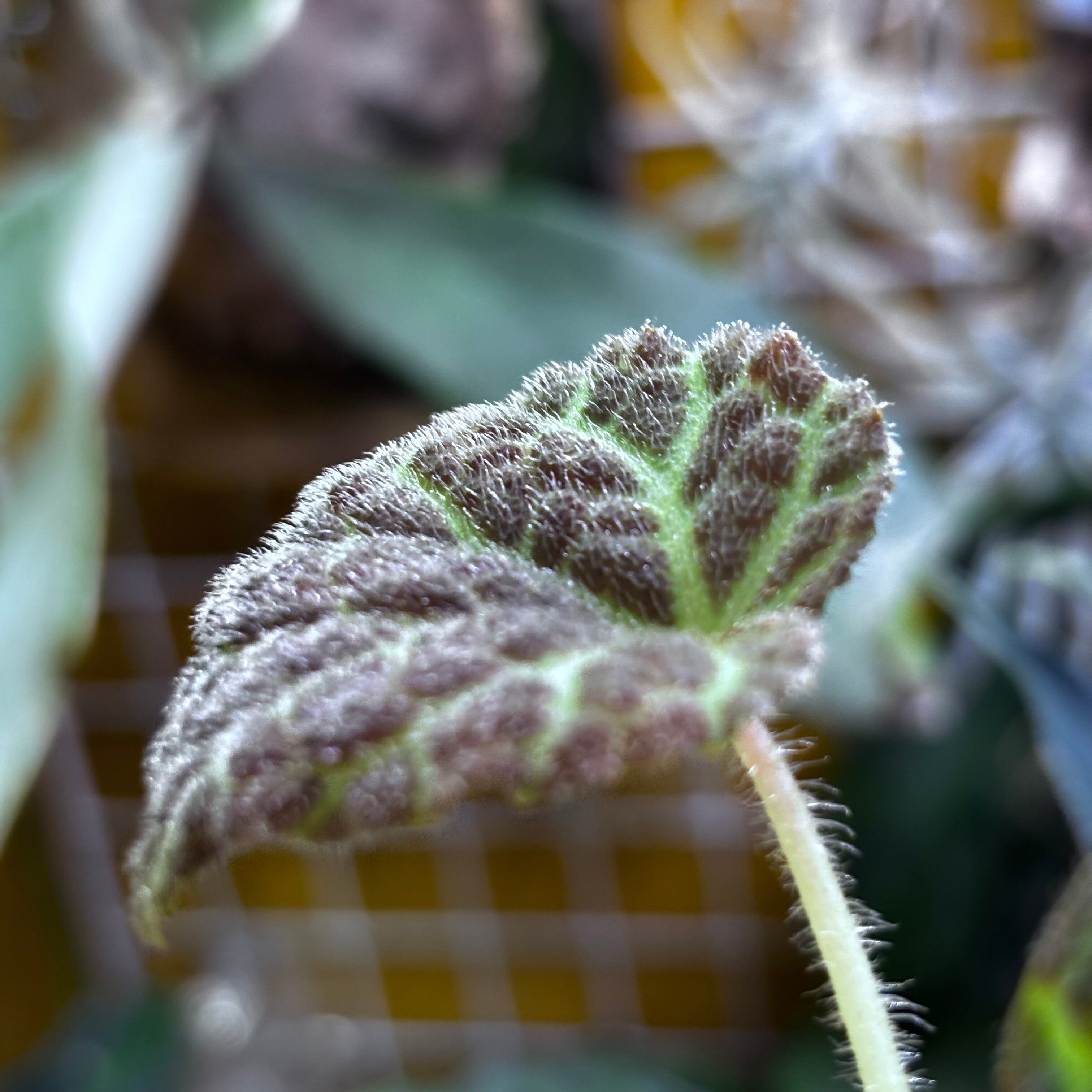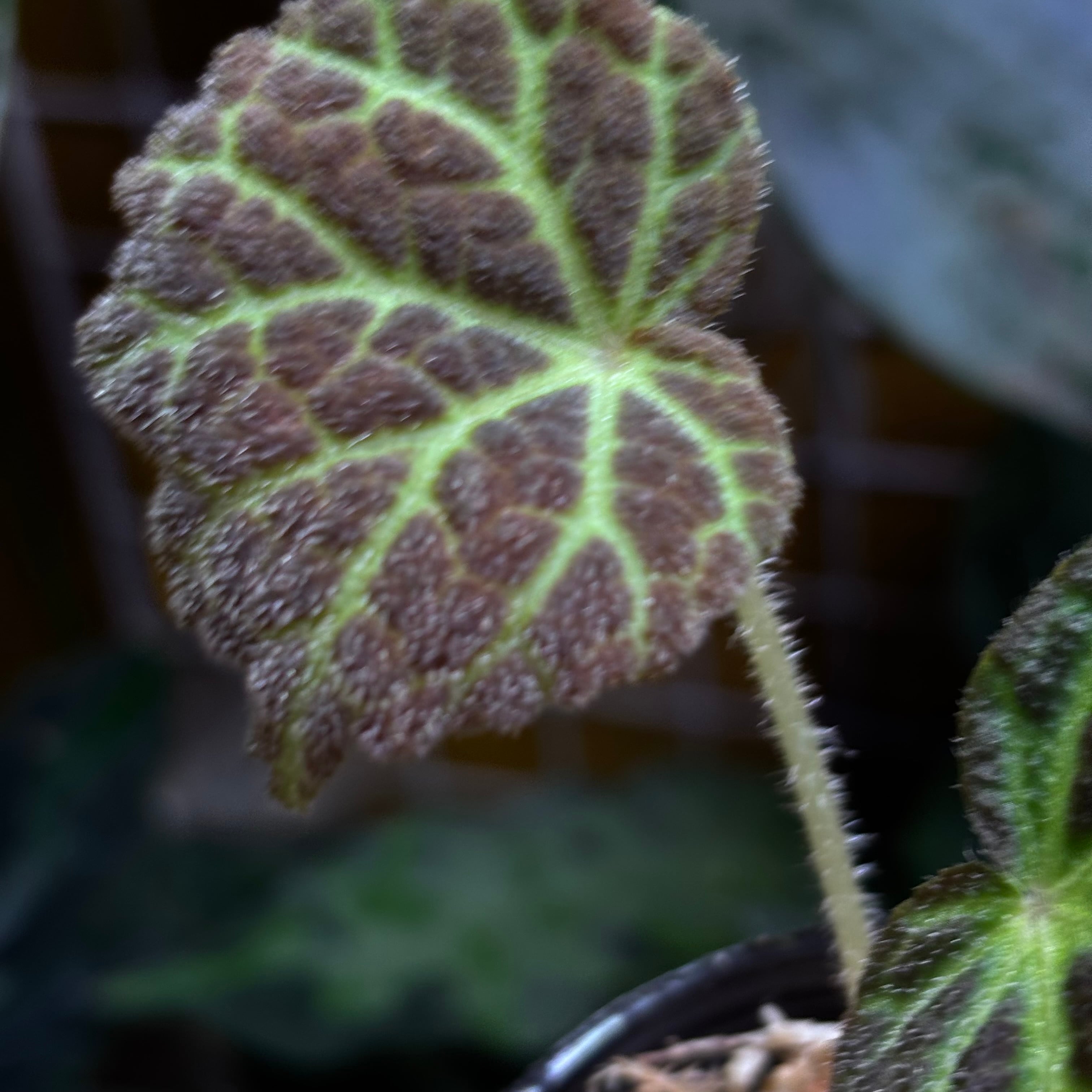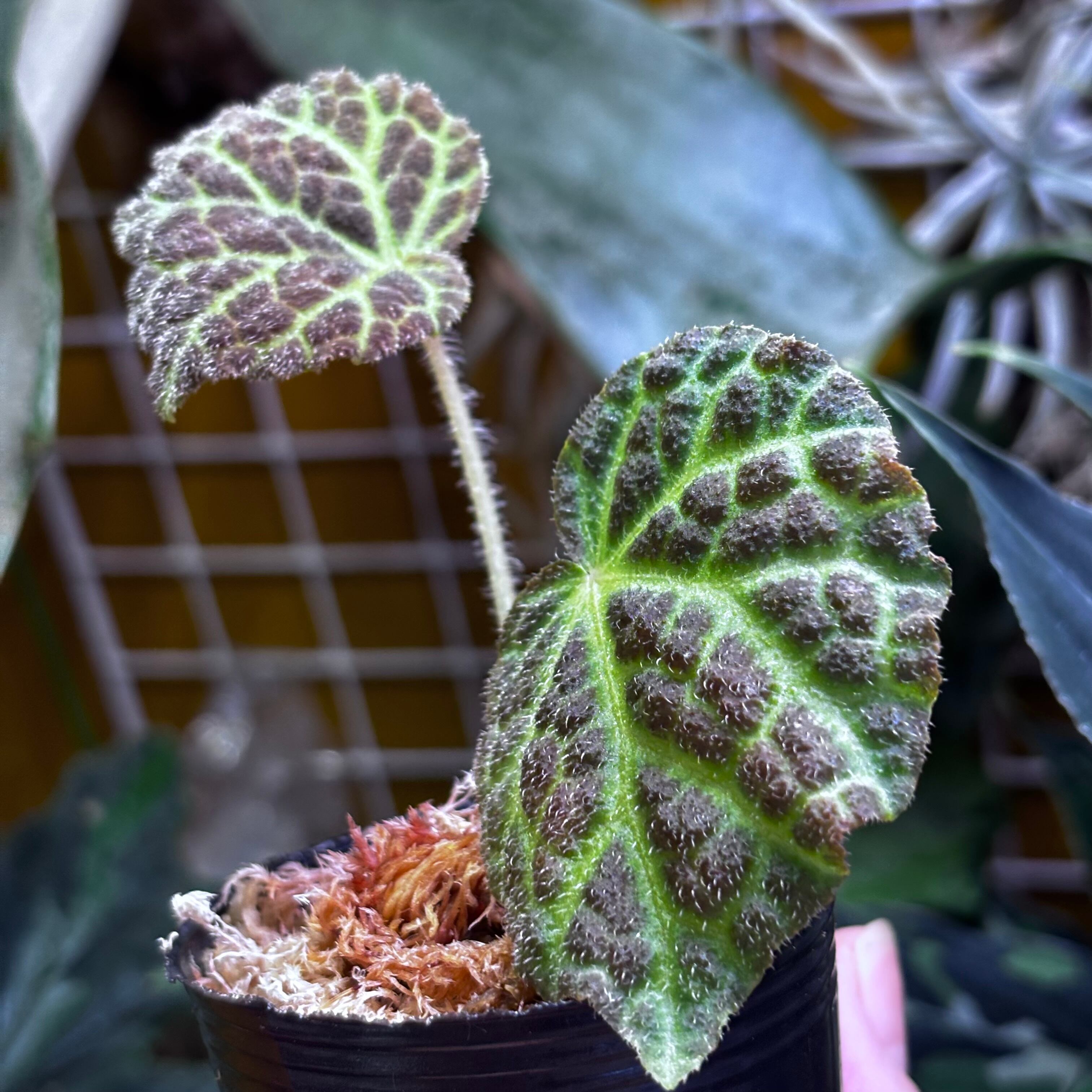 表面にザラザラとした産毛が生え、葉脈が光るように見える天鵞絨のベゴニアです。一見クロロネウラやデコラにも似ていますが、全くの別種です。