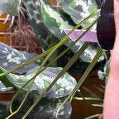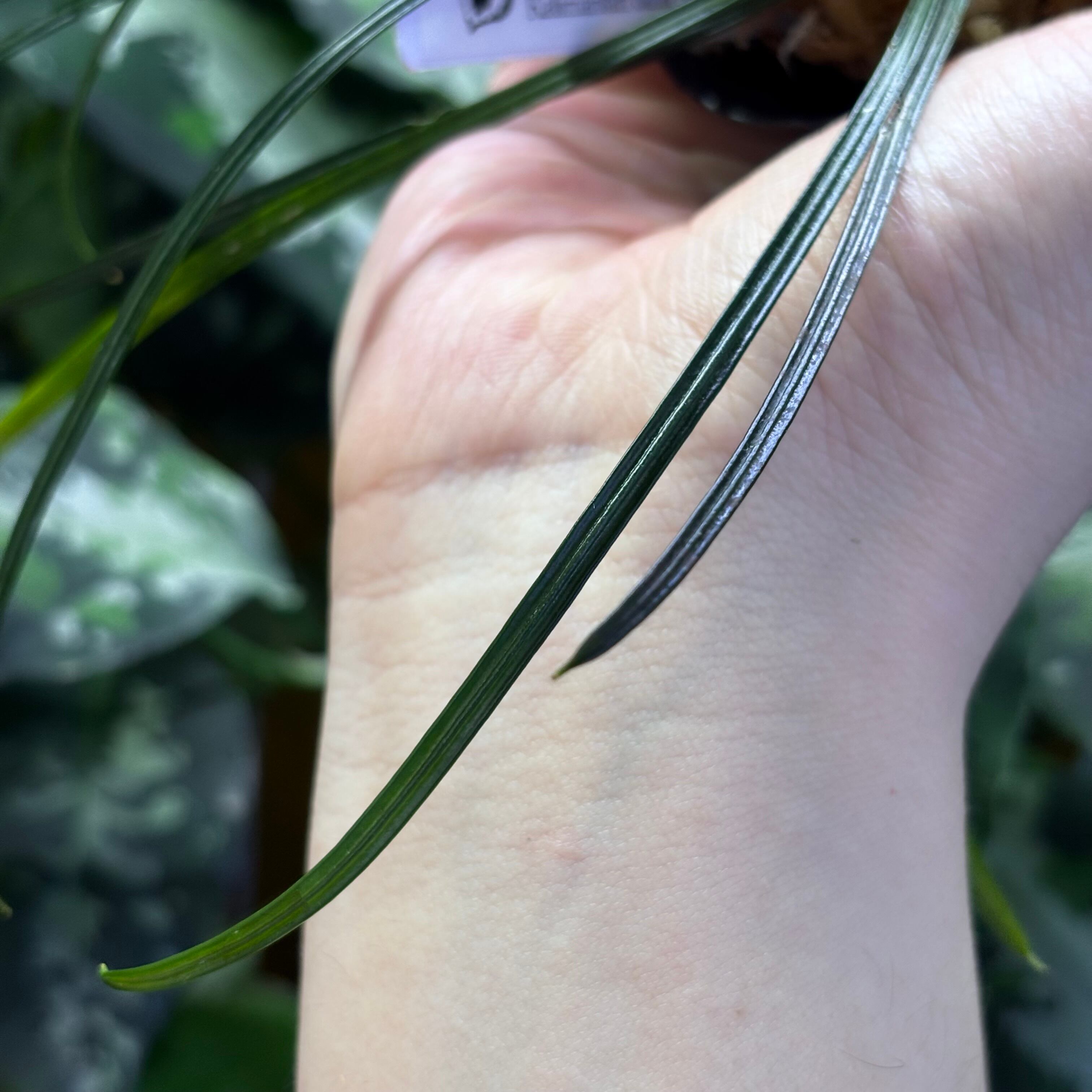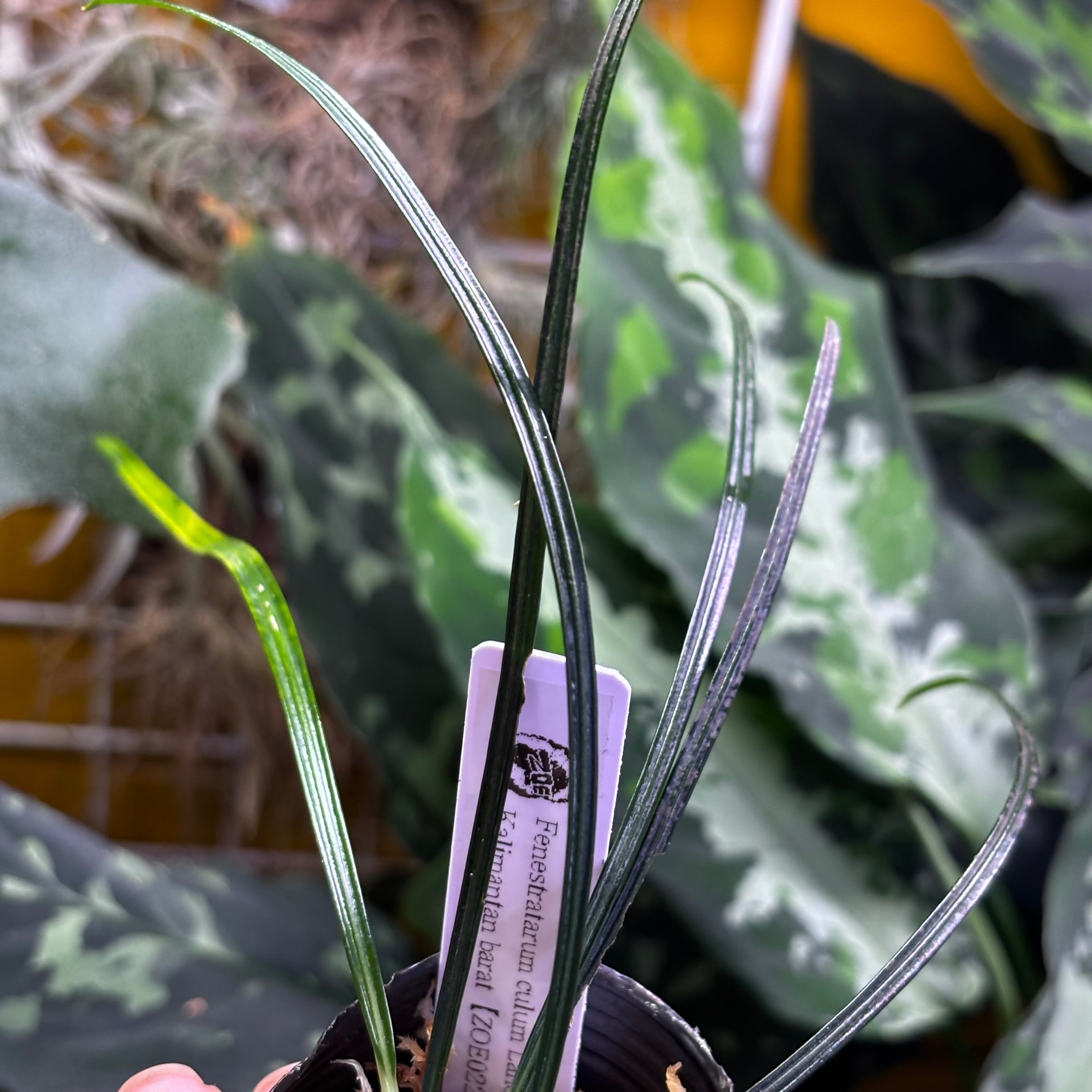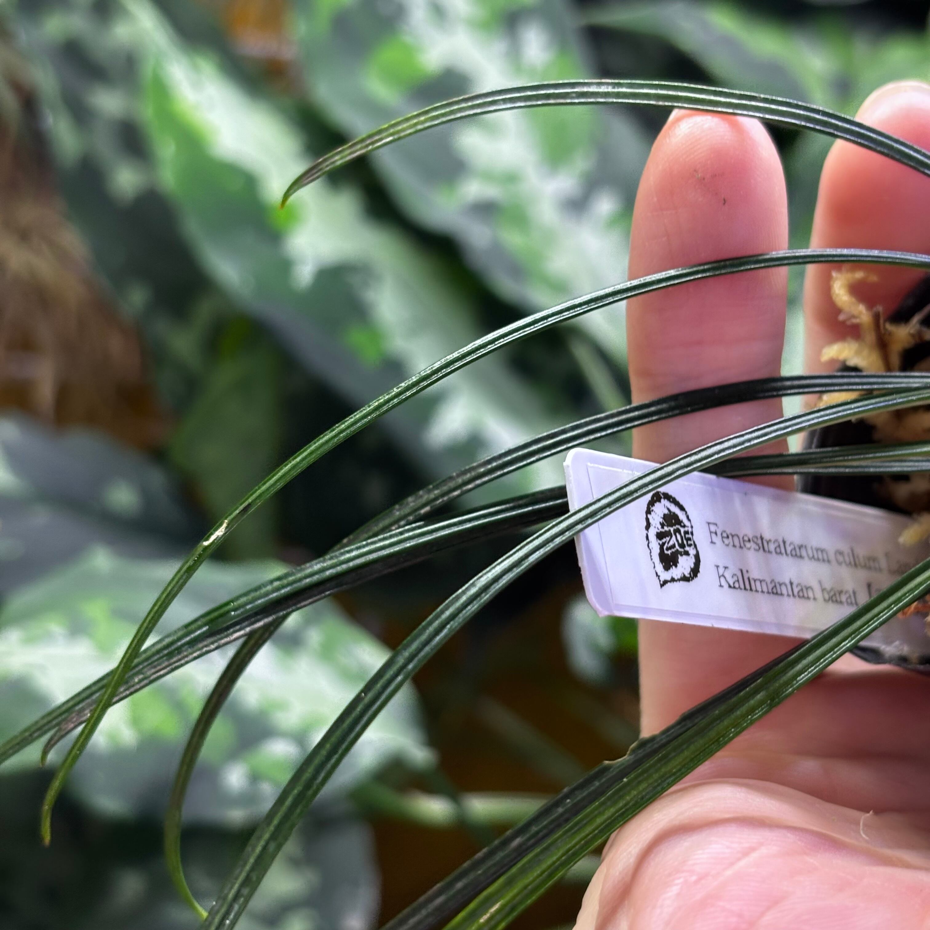 葉が非常に細長いフェネストラタルム。黒に近い葉色をしており非常にスタイリッシュな渓流系のサトイモです。白く大きな花を咲かせることでも有名です。
