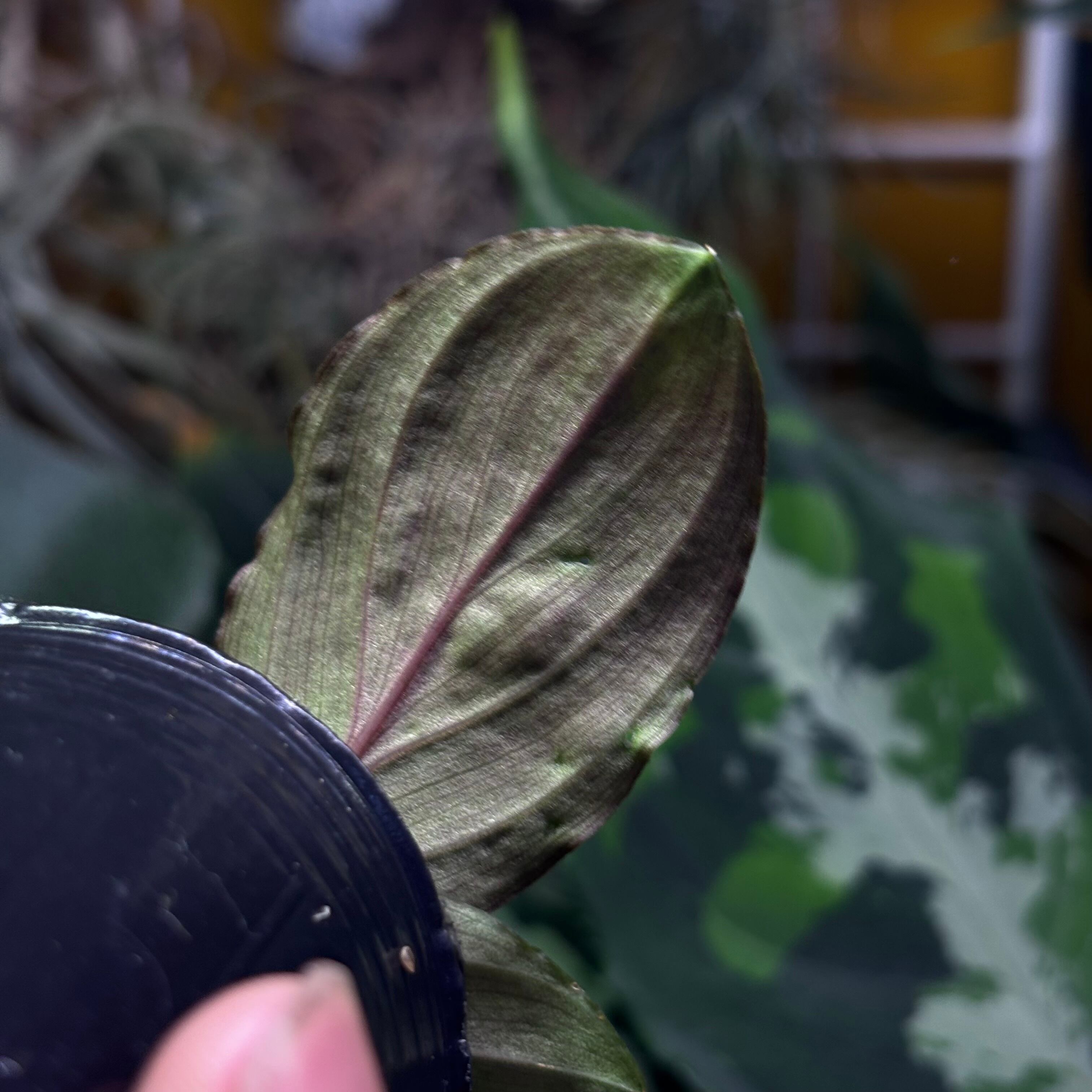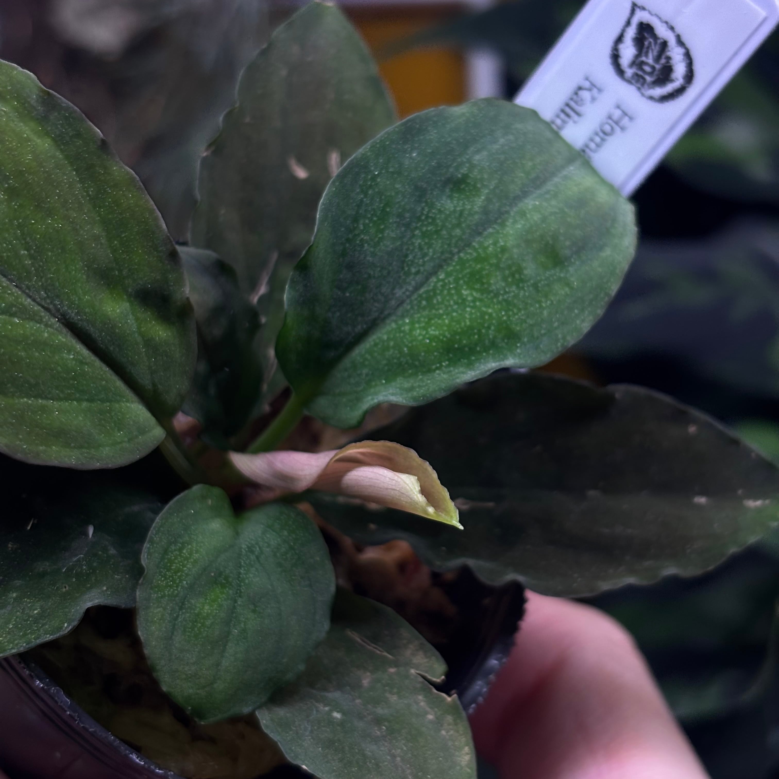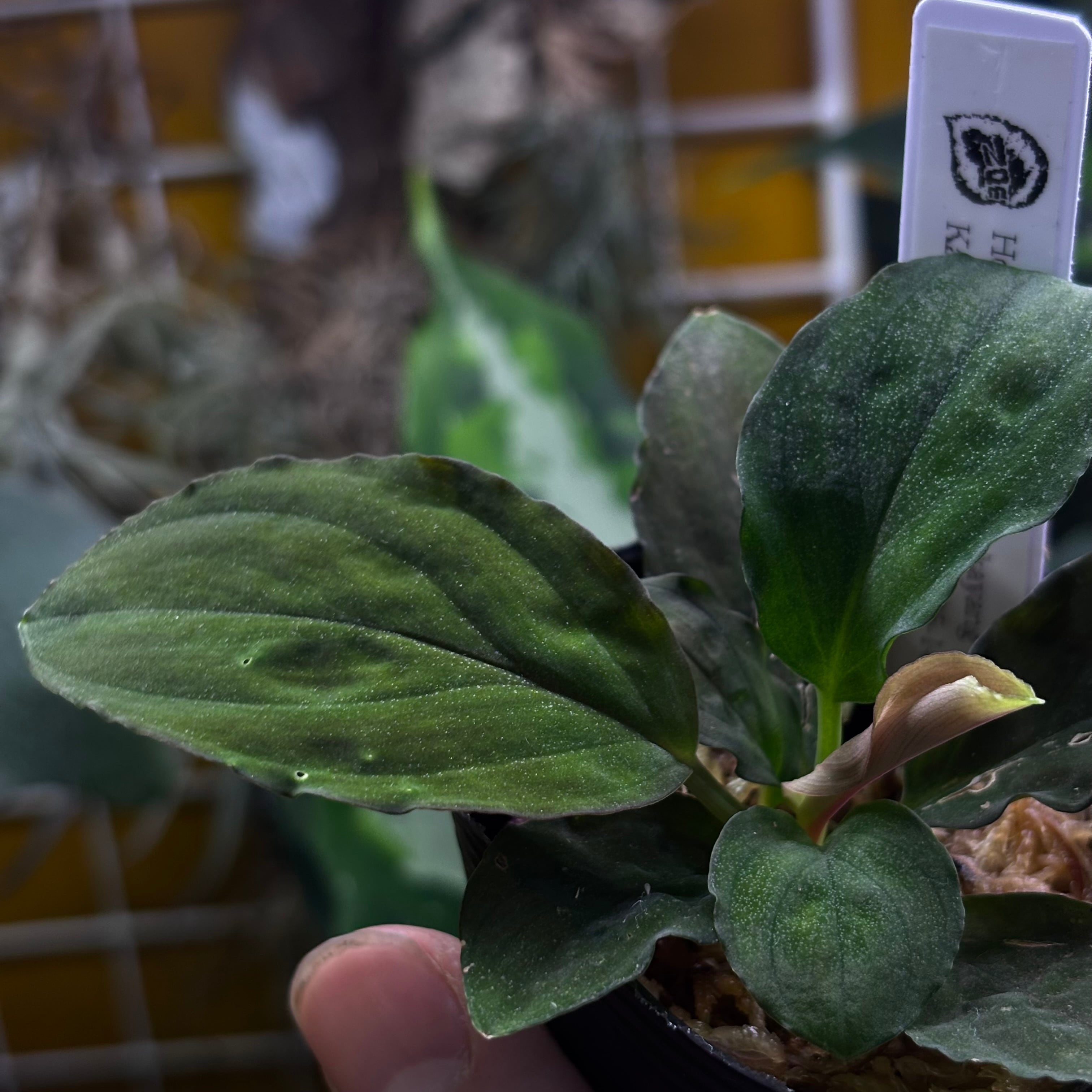 天鵞絨とラメが入っている美しいホマロメナ。こちらの個体は濃いグリーンタイプ。葉裏は少し赤くなります。