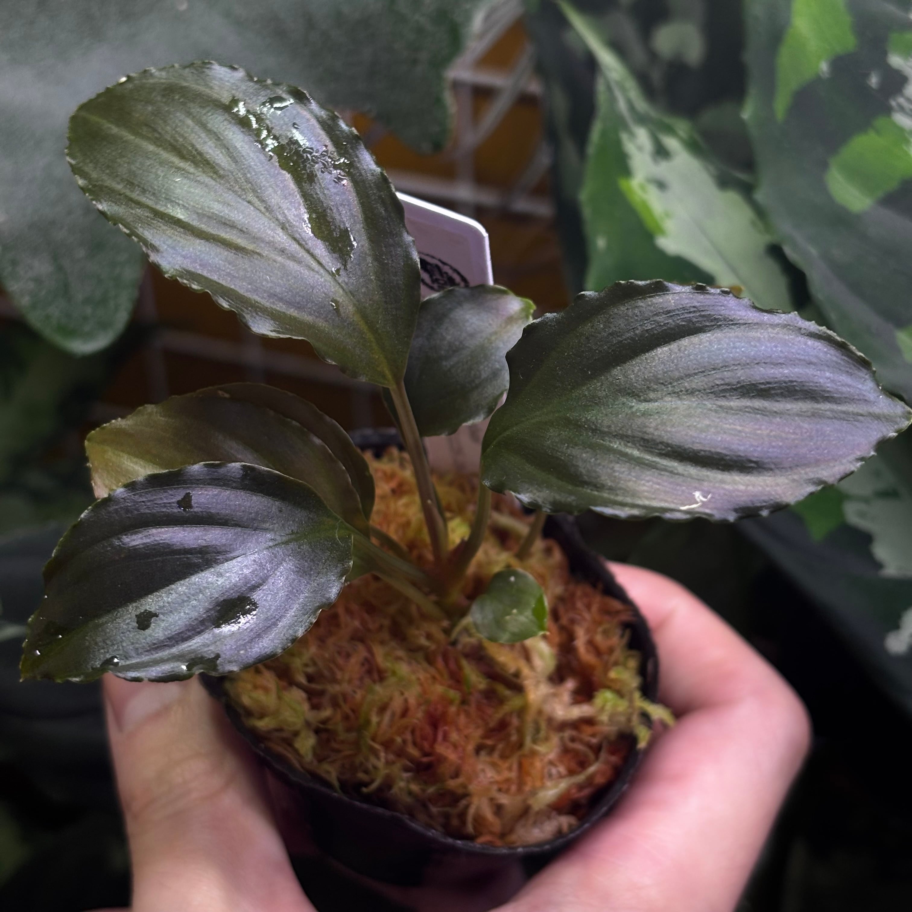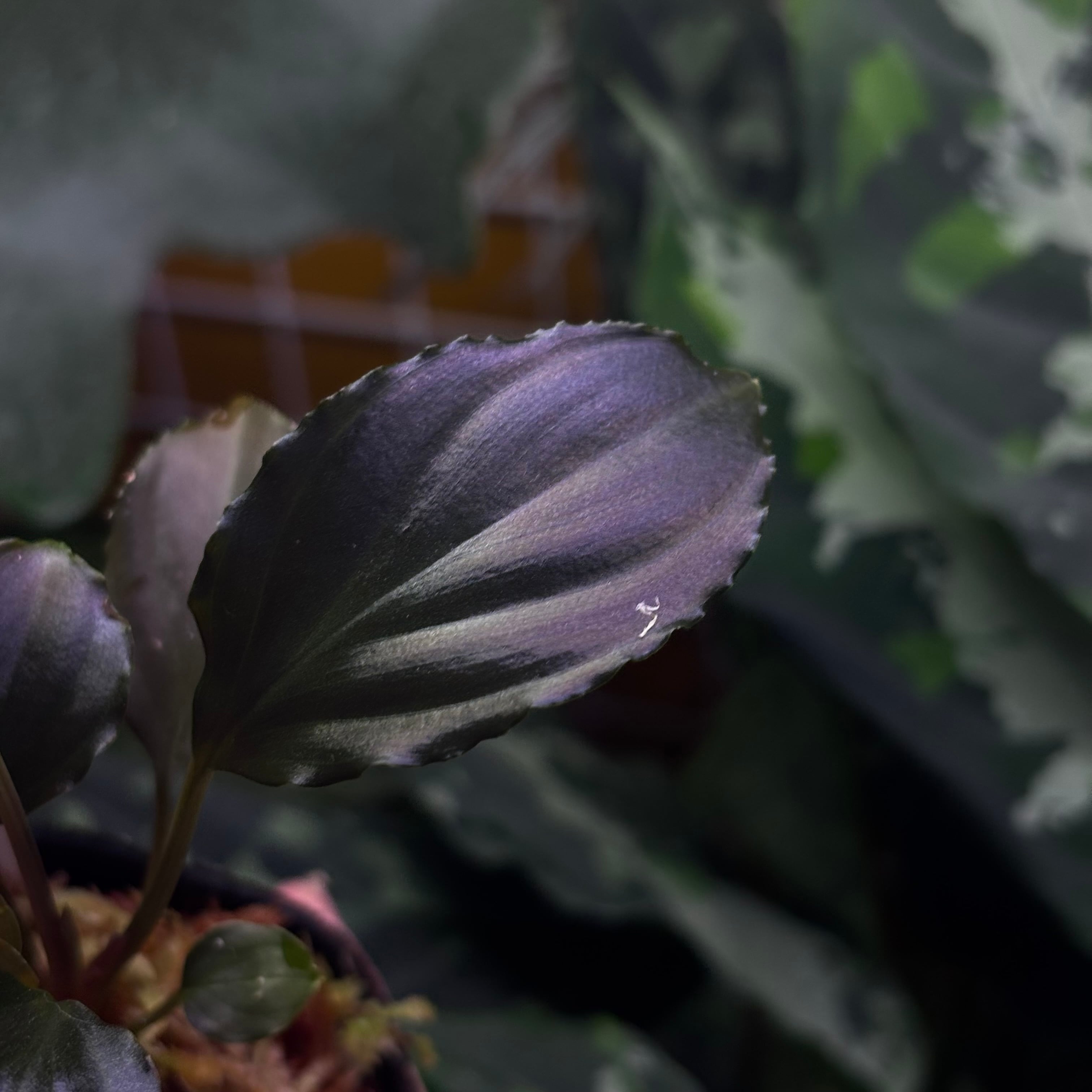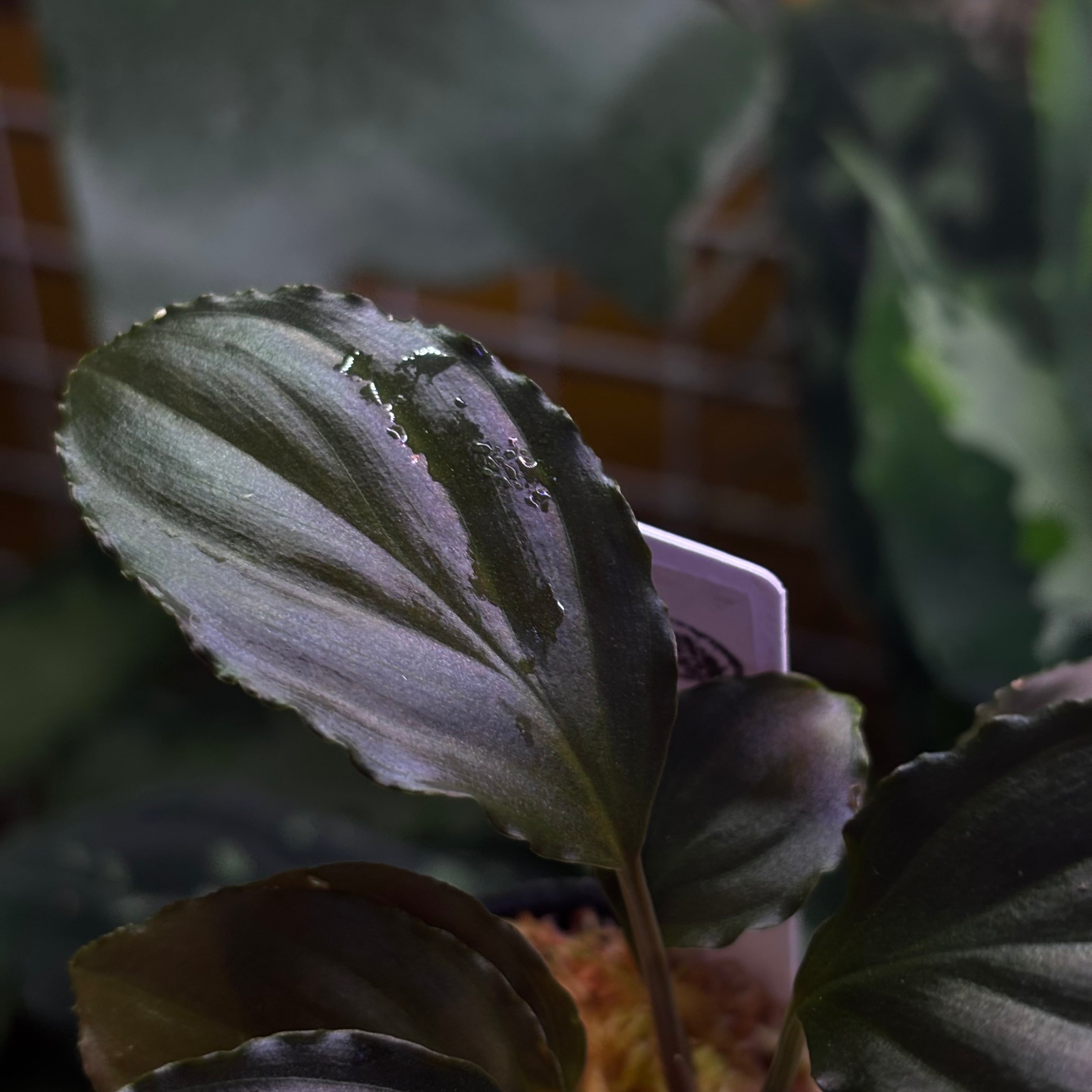 メタリックな黒葉の小型ホマロメナ。葉脈の掘りも深く、光沢と合わさり非常に綺麗です。