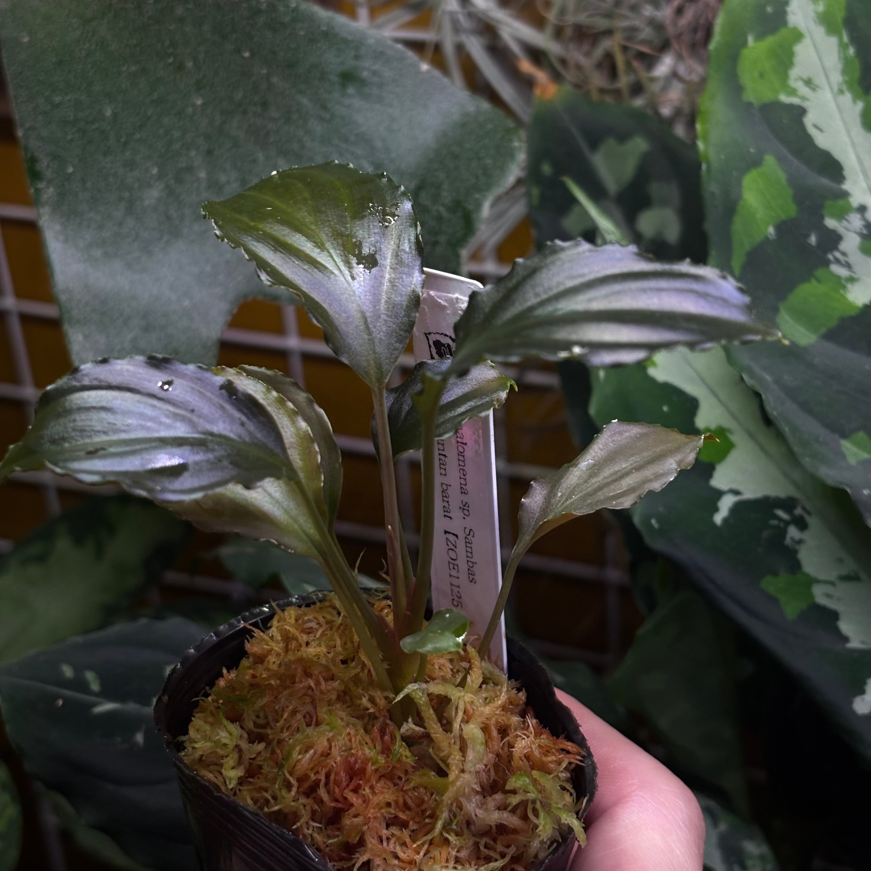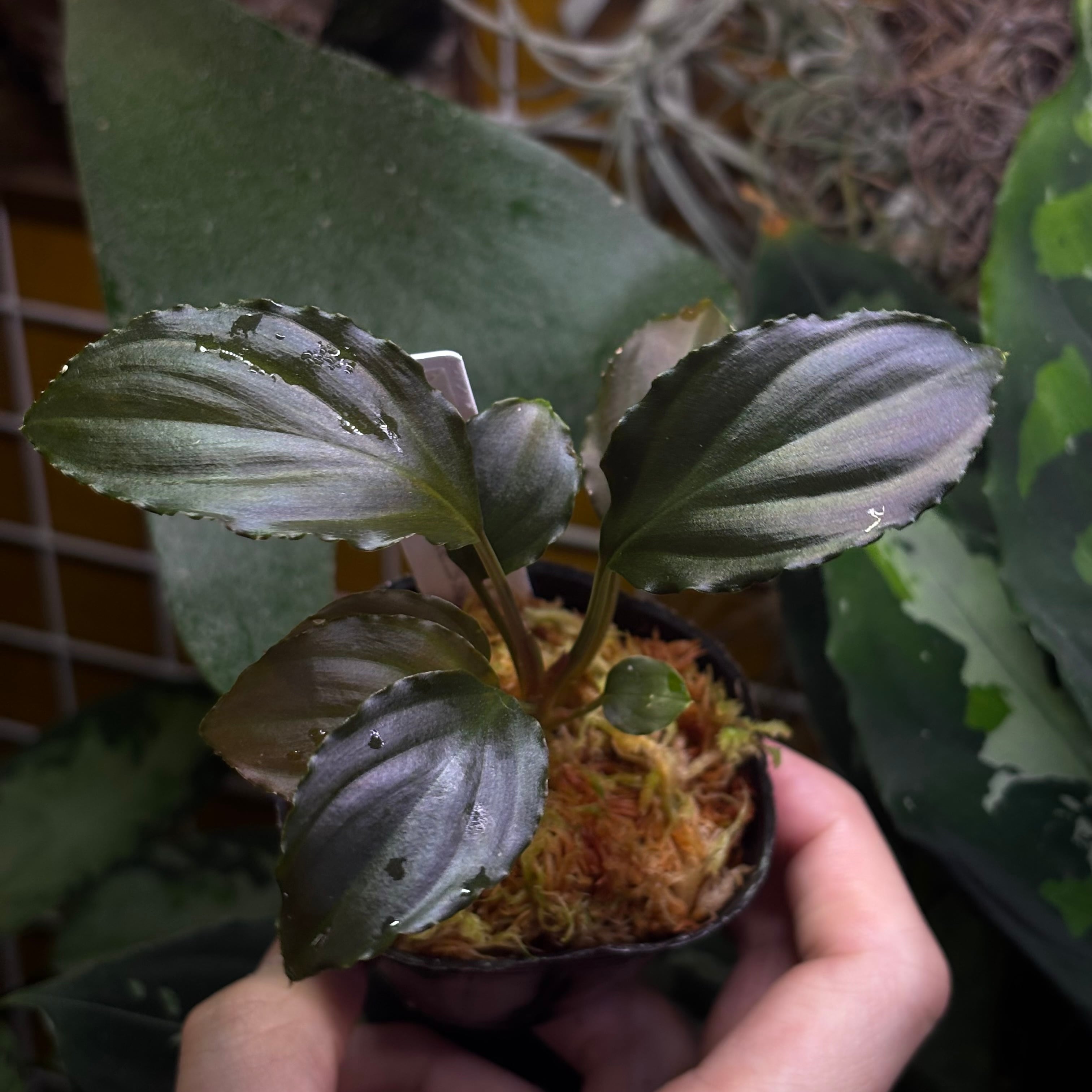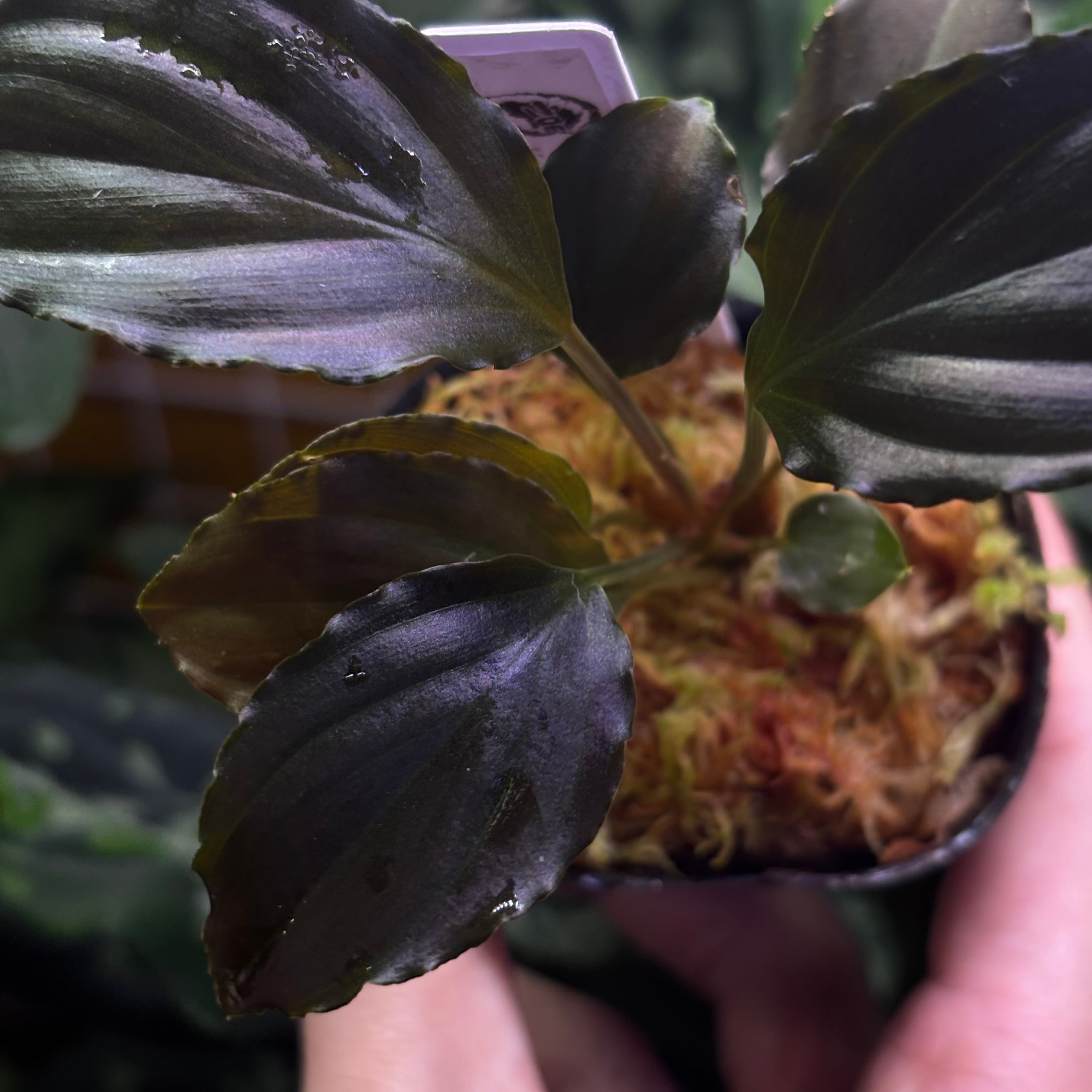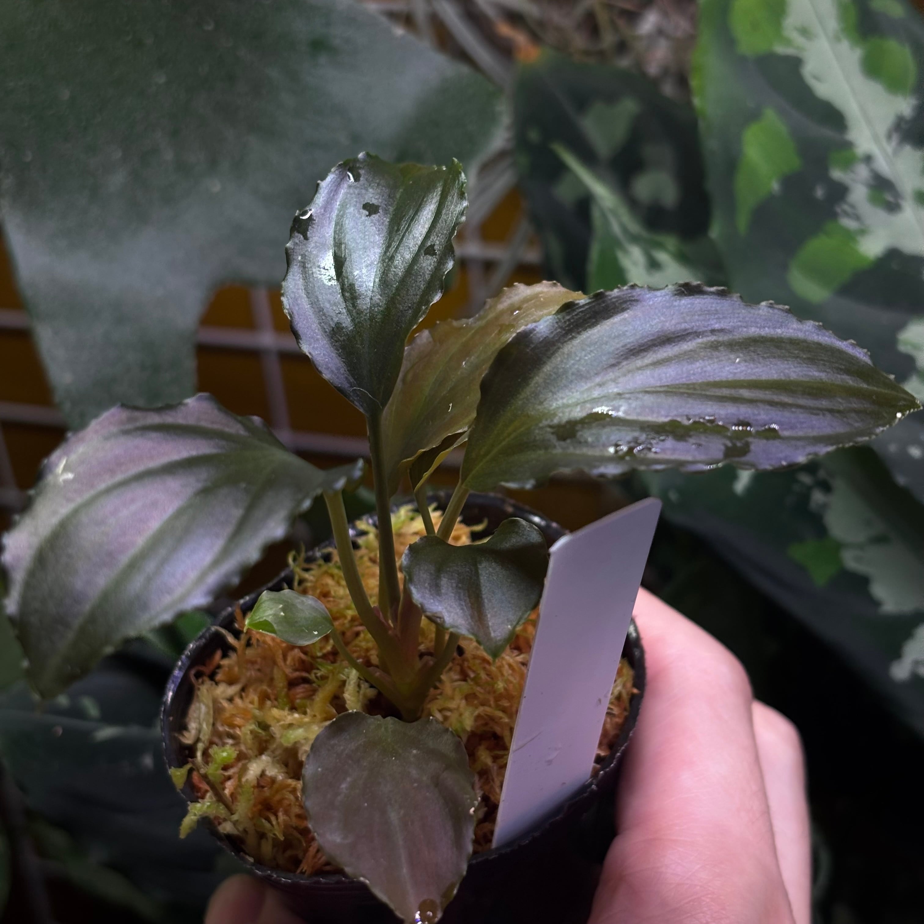 メタリックな黒葉の小型ホマロメナ。葉脈の掘りも深く、光沢と合わさり非常に綺麗です。