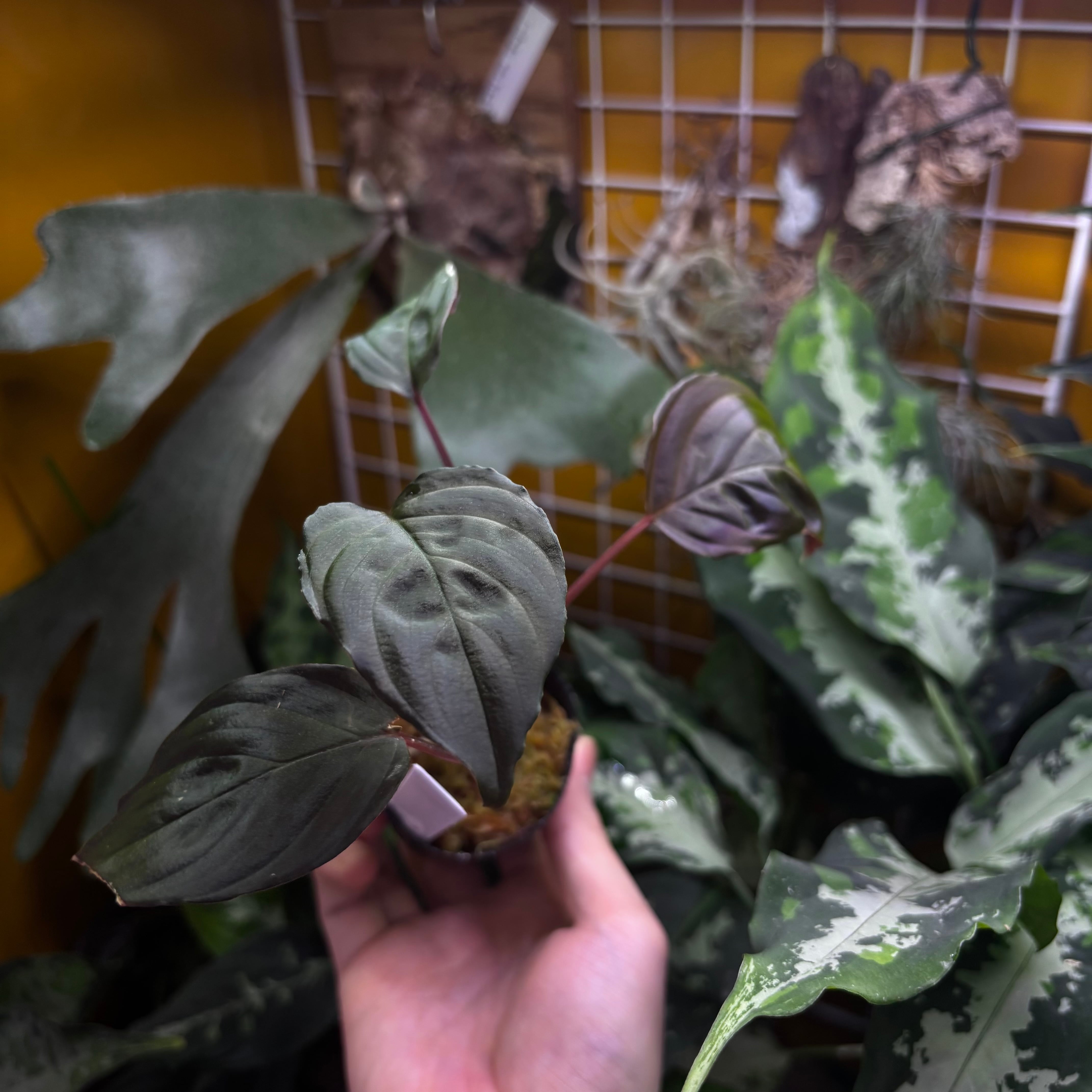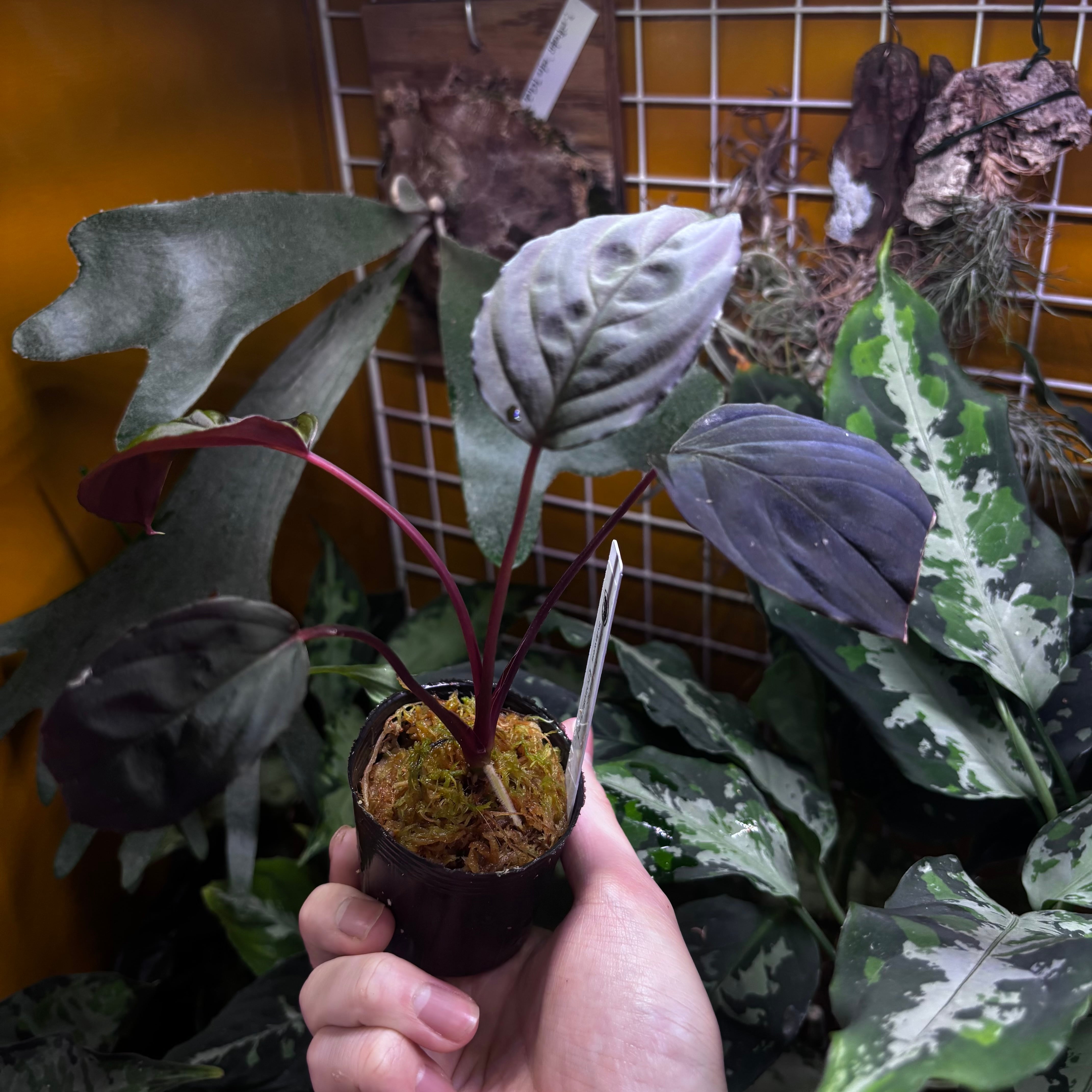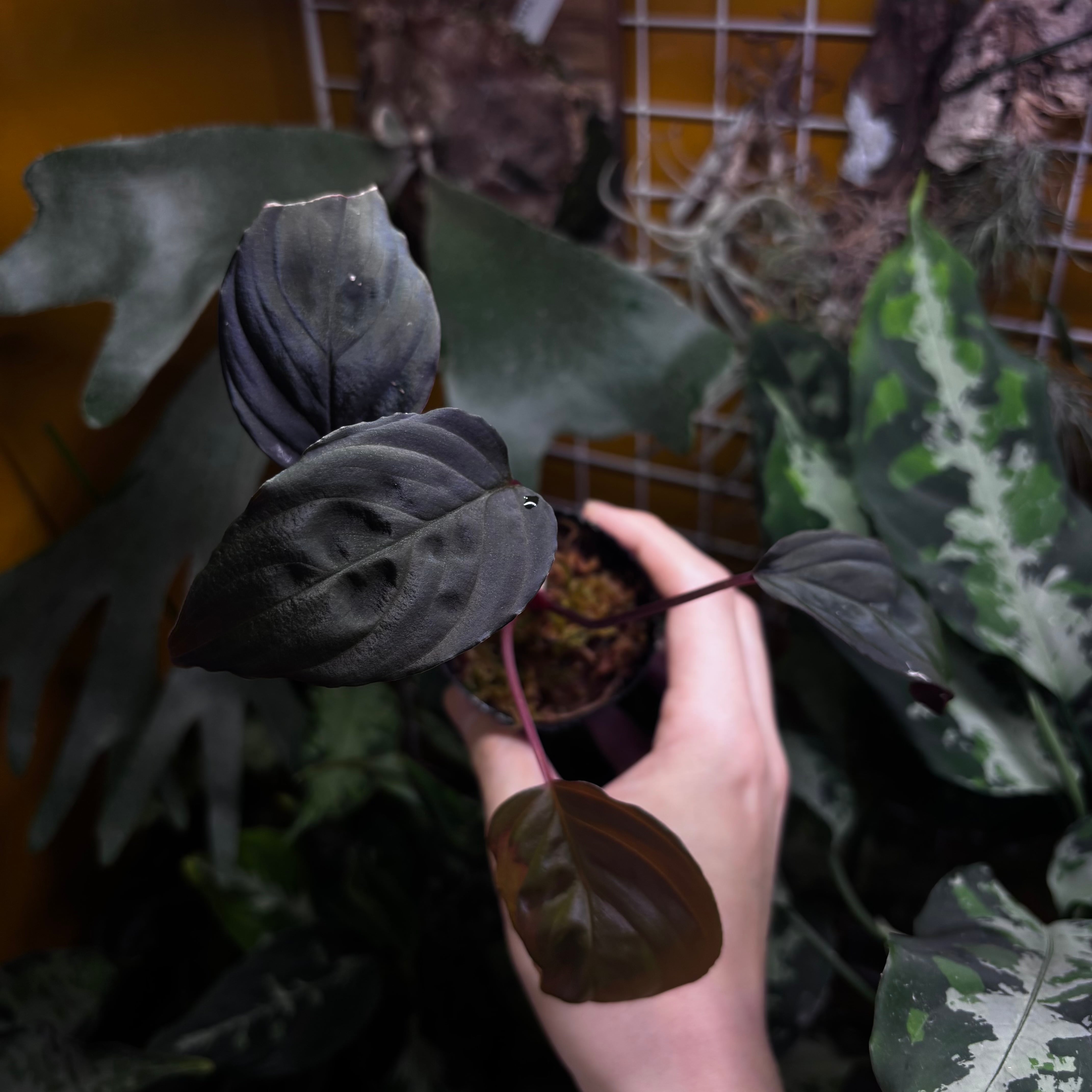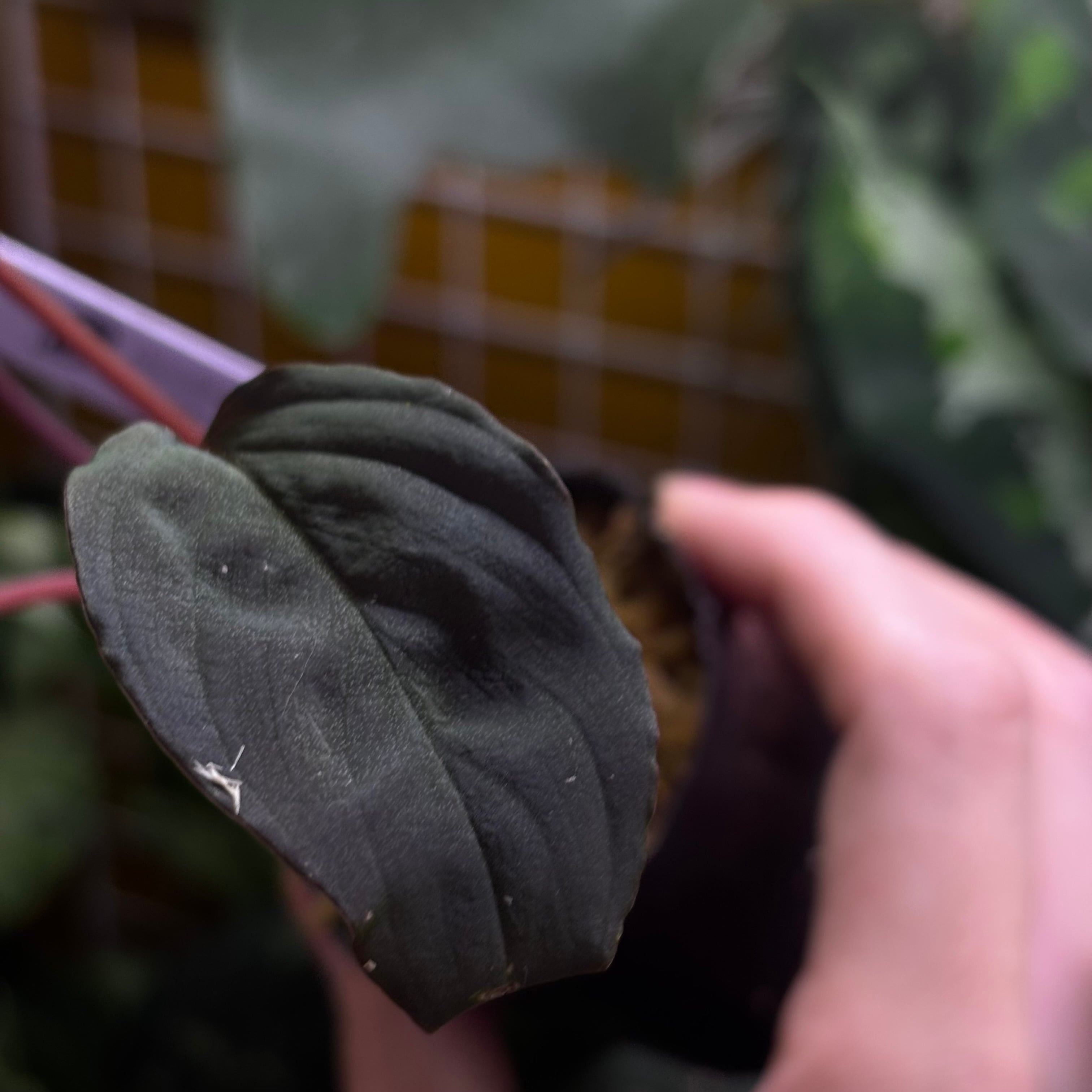 茎が赤く天鵞絨のある黒葉のホマロメナ。