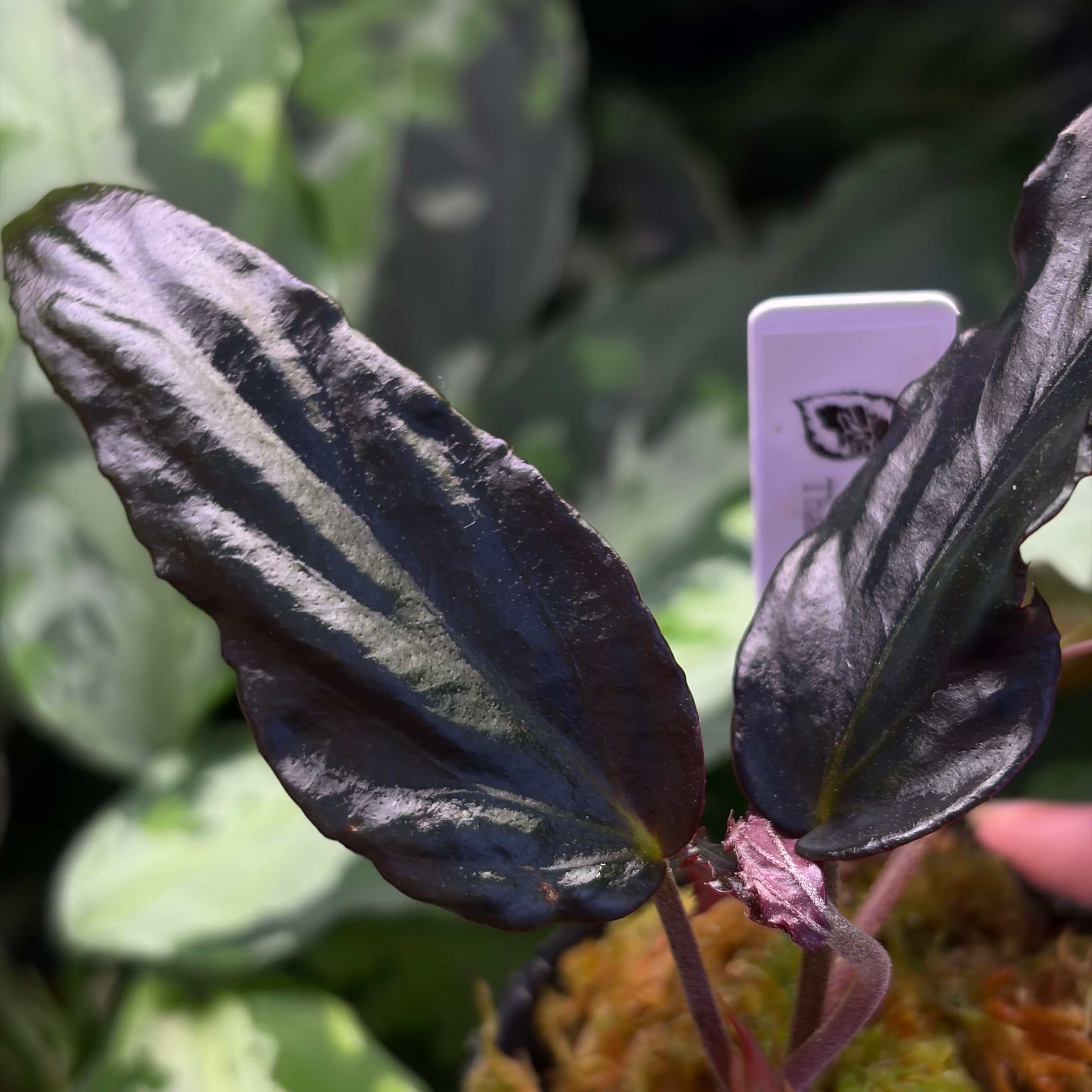 艶のある黒葉で、細葉で葉の外側にややフリルがあります。一見ホマロメナのように見えますね。葉脈が血管のように細かく現れるのもカッコいい特徴です。